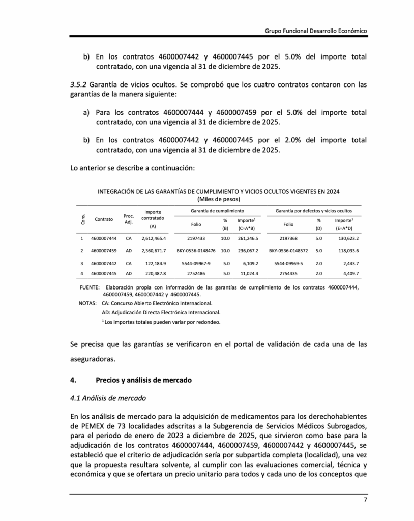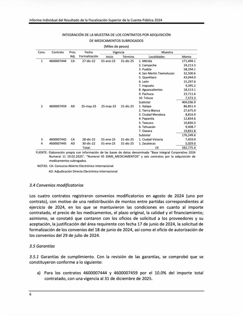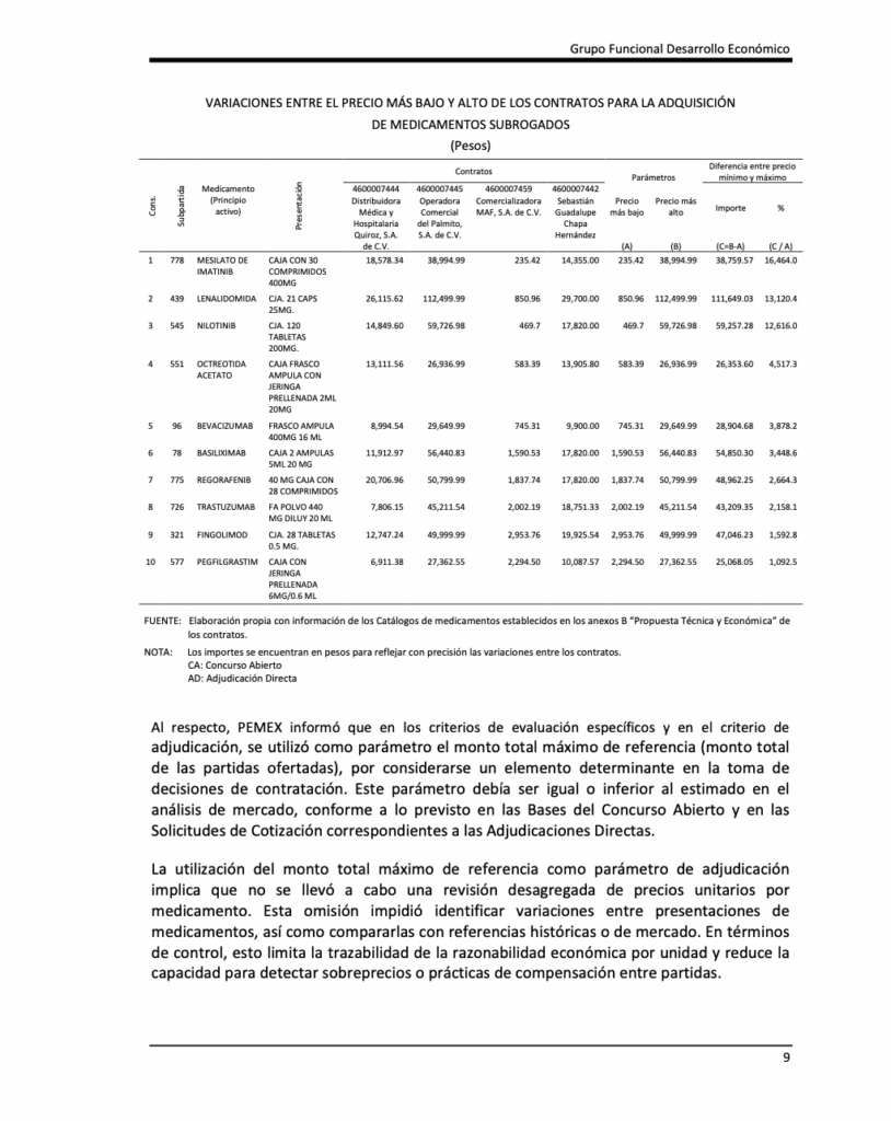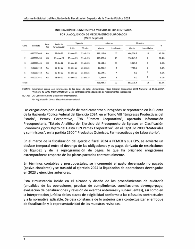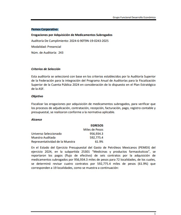 Denuncia al 9933989844… 🚩⚠️💊 ¡Precios inflados en medicina subrogada Pemex: ASF 2024! En la ronda de 31 auditorías a la cuenta pública de @Pemex en el ejercicio del año 2024, la Auditoría Superior de la Federación (ASF) identificó deficiencias de control y transparencia en una muestra de contratos por 592 millones 775 mil 400 pesos destinados a medicamentos subrogados de @Pemex en la Auditoría de Cumplimiento: 2024-6-90T9N-19-0243-2025 a @Pemex Corporativo. El dictamen indica un cumplimiento normativo general, la fiscalización detectó irregularidades que persisten tras la revisión, destacando variaciones de precios de hasta 16,464.0% y la falta de acreditación de entregas en Ciudad Victoria, Tamaulipas. Por estos hechos, se logró una recuperación de 21,891.96 pesos por recetas inválidas y se emitieron una recomendación para corregir los análisis de mercado, así como una promoción de responsabilidad administrativa sancionatoria para que se investigue a los servidores públicos que autorizaron pagos sin la documentación comprobatoria necesaria. El hallazgo forma parte de la Auditoría de Cumplimiento 243 de la Cuenta Pública 2024, practicada a @Pemex Corporativo, cuyo objetivo fue fiscalizar las erogaciones destinadas a la compra de medicamentos subrogados y verificar que los procesos de adjudicación, contratación, recepción, facturación, pago y registro contable se realizaran conforme a la normativa aplicable. La revisión se centró en una muestra equivalente al 61.9% del universo auditado, ya que de un total de 956,934,300 pesos pagados en 6 contratos para 72 localidades, la ASF analizó cuatro contratos por 592 millones 775 mil 400 pesos que corresponden a 19 localidades. Los contratos analizados fueron los números 4600007444, 4600007459, 4600007442 y 4600007445, formalizados entre diciembre de 2022 y mayo de 2023, con vigencia del 1 de enero de 2023 al 31 de diciembre de 2025. El contrato 4600007444, adjudicado mediante concurso abierto internacional el 27 de diciembre de 2022, representó el mayor monto revisado con 404 millones 36 mil 900 pesos distribuidos en diez localidades: Mérida, Campeche, Puebla, San Martín Texmelucan, Querétaro, León, Irapuato, Aguascalientes, Pachuca y Toluca. El contrato 4600007459, adjudicado por adjudicación directa electrónica internacional el 25 de mayo de 2023, registró pagos revisados por 176 millones 249 mil 600 pesos en siete localidades: Xalapa, Tierra Blanca, Ciudad Mendoza, Papantla, Texcoco, Tehuacán y Oaxaca. Por su parte, el contrato 4600007442, también derivado de concurso abierto, registró 7 millones 459 mil 900 pesos para la localidad de Ciudad Victoria, mientras que el contrato 4600007445, adjudicado de forma directa, reportó 5 millones 29 mil pesos para Zacatecas. Uno de los principales hallazgos de la auditoría se relaciona con el análisis de mercado utilizado para determinar los precios de los medicamentos subrogados. La ASF detectó que los proveedores no cotizaron medicamentos para la totalidad de las 73 localidades consideradas en el estudio, lo que provocó que el universo de referencia no fuera homogéneo ni comparable. Esto generó problemas metodológicos en el análisis de precios, ya que los montos de referencia se calcularon con coberturas geográficas distintas, lo que afectó la comparabilidad de las cotizaciones y limitó la trazabilidad del criterio económico utilizado para adjudicar los contratos. Derivado de ello, la ASF identificó variaciones de hasta 16,464% entre el precio más bajo y el más alto contratado para algunos medicamentos, lo que impidió garantizar que las adquisiciones se realizaron en las mejores condiciones de eficiencia, economía y transparencia para el estado. Ante estas irregularidades, la ASF emitió una recomendación para que qPemex revise y modifique la metodología de análisis de mercado, incorporando criterios técnicos y geográficos más precisos y mecanismos que permitan detectar y excluir precios atípicos. Durante la revisión de la entrega de medicamentos, la ASF analizó 1,007 relaciones de recetas y 739,892 recetas médicas correspondientes a las 19 localidades auditadas. Aunque en términos generales se comprobó que los medicamentos se entregaron y facturaron conforme a los contratos, se detectaron deficiencias de control interno, entre ellas recetas sin firma del médico prescriptor o del derechohabiente y firmas que no coincidían con las registradas en los catálogos autorizados por @Pemex . Además, algunos reportes de conformidad no contaban con la firma del Jefe de Departamento Sectorial, lo que debilitó la validación administrativa de las entregas. Tras la intervención de la ASF, los proveedores realizaron un reintegro de 21 mil 891.96 pesos, correspondiente a recetas que no cumplían con los requisitos contractuales para su validación. La ASF también identificó irregularidades específicas en el contrato 4600007442, correspondiente a la localidad de Ciudad Victoria. De acuerdo con las condiciones contractuales, el suministro debía realizarse bajo el denominado “Modelo B”, mediante pedidos formales del médico subrogado a través del formato “Pedido de Medicamentos”, con plazos de entrega de 36 a 72 horas. Sin embargo, la revisión reveló que los medicamentos fueron entregados directamente a los derechohabientes en farmacias del proveedor y que los documentos contractuales carecían de fecha y hora de entrega, lo que impidió verificar el cumplimiento del plazo. Asimismo, no se acreditó la validación de las entregas por parte del supervisor médico sectorial ni la eventual aplicación de penas convencionales por incumplimiento. Por estas irregularidades, la ASF promovió una promoción de responsabilidad administrativa sancionatoria, para que la Unidad de Responsabilidades en @Pemex investigue la actuación de los servidores públicos que autorizaron pagos sin contar con la documentación que acreditara 