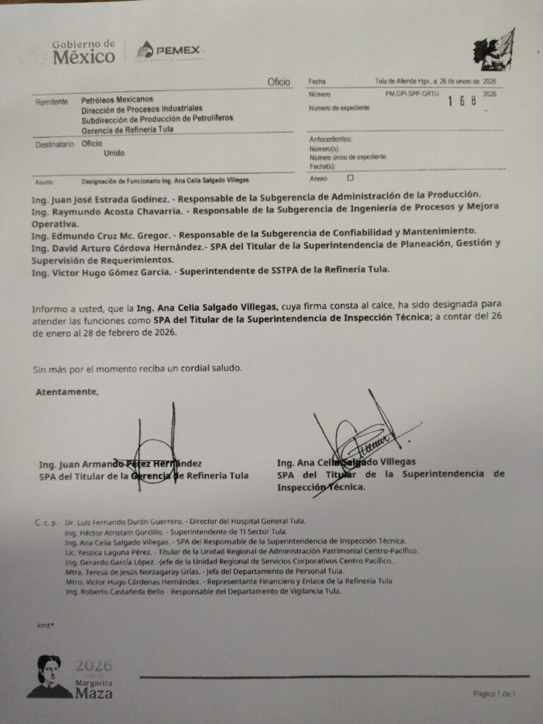 Denuncia al 9933989844… 🚩⚠️❗️¡Premian corrupción de ANA CELIA en refinería de Tula Pemex!; le dan más mérito a la prepotencia de Ana Celia Salgado Villegas del Departamento de Inspección Técnica en la refinería de Tula, Hidalgo, del recién nombrado gerente Juan Armando Pérez Hernández, por lo que los trabajadores temen más represalias en su contra, ya que fue nombrada SPA del Titular de la Superintendencia de Inspección Técnica por unos días mediante el oficio PM-DPI-SPP-GRTU-168-2026 durante el tiempo que duren las vacaciones de su jefe y tapadera Ángel Francisco Garduza Madrigal. Todo parece indicar que como el gerente es nuevo lo agarraron en sus 5 minutos de distracción ya que Ana Celia Salgado Villegas tiene negros antecedentes en el complejo. Todavía sigue abierta la denuncia que Ana Celia Salgado Villegas interpuso por unos volantes que estuvieron circulando en contra de 4 trabajadores (Daniel Antonio Sánchez Aldama López, Álvaro Mendoza Rufino, Ricardo Lara Delgado y Jose Antonio Martín Guadarrama) del Departamento de Inspección Técnica y Seguridad Industrial (DITSI) en el Ministerio Público Federal (MPF) por discriminación, pero falseando información -según denunciantes- ya que puso de testigo a su esposo René Trejo Aquino, ayudante de trabajos del Departamento de Inspección Técnica y Seguridad Industrial, N-10 sindicalizado, en sus declaraciones alegando daño psicológico que después se supo fue mentira. Asimismo, ayudó indebidamente a su esposo sindicalizado y perteneciente al Departamento de Inspección Técnica en una categoría baja (Nivel-10) y quien aspira a ascender al Nivel-25, ya que los cursos solo aprobaron 2 de 30 participantes, favoreciendo a compañeras transitorias que no afectarían el ascenso de su cónyuge. Estas entre otras anomalías reportadas por los trabajadores afectados quienes no se explican cómo le dieron más poder para afectarlos. Atención @Claudiashein @MarcelaVilleg15 @CNE_Mex @SENER_mx @GobiernoMX @FGRmexico @LuzElena_GE @ASF_Mexico @SCJN @STPS_mx @Tu_IMSS @SEMARNAT_mx @agencia_asea @CENAGAS_mx @IMPetroleo @SATMX @Hacienda_Mexico @BuenGobierno_mx @Centrofcrl #OIC #UIF #OmarReyesColmenares …Zas!!!