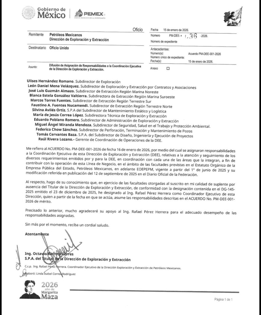 Denuncia al 9933989844…🚩‼️⚠️¡RAFAEL PÉREZ HERRERA, nuevo Coordinador Ejecutivo de OCTAVIO BARRERA/DEE-PEP!; el ex subdirector Técnico de Exploración y Producción (STEP) y jubilado vuelve a la marquesina petrolera como coordinador ejecutivo de la Dirección de Exploración y Extracción (DEE antes PEP), donde ahora manda el SPA Octavio Barrera Torres; Rafael Pérez Herrera llega en sustitución de José Luis Chávez Suárez, quien era el coordinador ejecutivo del ex director de la DEE-PEP, Ángel Cid Munguía, quien fue suplido por Octavio Barrera Torres, este mes, datado aquí. Como revela el oficio número PM-DEE-036-2026 del 15 de enero 2026 pasado, con el asunto: Difusión de Asignación de Responsabilidades a la Coordinación Ejecutiva de la Dirección de Exploración y Extracción (DEE), Rafael Pérez Herrera llega para la atención y seguimiento de los diversos requerimientos emitidos por y para la DEE, en coordinación con cada una de las áreas que la integran, a fin de contribuir con la operación de esta Línea de Negocio, en el ámbito de las facultades previstas en el Estatuto Orgánico de la Empresa Pública del Estado, Petróleos Mexicanos (EOEPEPM) vigente a partir del 01 de junio de 2025 y su modificación referida en publicación del 12 de septiembre de 2025 en el Diario Oficial de la Federación (DOF). Cabe destacar que la plana mayor de DEE-PEP sigue así: Ulises Hernández Romano, subdirector de Exploración (SE); León Daniel Mena Velázquez, subdirector de Exploración y Extracción por Contratos y Asociaciones (SEECA); José Luis Guzmán Almazo, subdirector de Extracción Región Marina Noreste (SERMNE); Blanca Estela González Valtierra, subdirectora de Extracción Región Marina Suroeste (SERMSE); Marcos Torres Fuentes, subdirector de Extracción Región Terrestre Sur; (SERTS); Faustino A. Fuentes Nucamendi, subdirector de Extracción Región Terrestre Norte (SERTN); Silvina Avilés Ortiz, SPA del Subdirector de Mantenimiento Estático y Logística (SMEL), Jorge García García; María de Jesús Correa López, subdirectora Técnica de Exploración y Extracción (STEE); Eduardo Poblano Romero, subdirector de Administración de Exploración y Extracción (SAEE); Miguel Ángel Miranda Mendoza, subdirector de Seguridad, Salud en el Trabajo y Protección Ambiental (SSSTPA); Federico Chow Sánchez, subdirector de Perforación, Terminación y Mantenimiento de Pozos (SPTMP); Tomás Cervantes Baza, SPA del subdirector de Diseño, Ingeniería y Ejecución de Proyectos (SDIEP), donde estaba Octavio Barrera Torres; y Raúl Rivera Lozano, gerente de Coordinación de Operaciones (GCO) de la DEE, quien dependerá del nuevo coordinador Rafael Pérez Herrera. Por su parte, la designación de Octavio Barrera Torres al frente de DEE-PEP en realidad fue la última jugada del efímero ex director de PEP-DEE, Néstor Martínez Romero, que solo duró 3 meses en el cargo a finales de 2024 y principios de 2025, quien de salida logró colocar a Octavio Barrera Torres como subdirector de Diseño, Ingeniería y Ejecución de Proyectos (SDIEP) ante la intempestiva llegada de Ángel Cid Munguía a la DEE-PEP, a quien terminó supliendo este mes de enero 2026, en donde también tendrá injerencia su mano derecha Ricardo Rodríguez Pensado, con quien trabajó cuando fue gerente de Planeación de la Región Marina Suroeste y el subdirector en turno era Juan Arturo Hernández Carrera. Ajeno al grupo del Agrónomo, Octavio Barrera Torres tiene ahora la oportunidad de pegarle una zamarreada a la estructura que dejó el Agrónomo y compañía en las subdirecciones, gerencias y coordinaciones en donde se dedicaron a inflar cifras, fieles a su maestro y la mayoría del Activo de Extracción Cantarell (AEC) donde aprendieron a contar barriles de agua, en donde Ángel Cid Munguía jugaba el papel de títere del @Infonavit . Esta mafia enquistada administró mal los yacimientos, inflaron los proyectos de recuperación secundaria y las plantas de inyección ni sirven, por lo menos 3 fueron vandalizadas, todo para justificar trabajos extraordinarios y moches, por lo que de seguir la hegemonía no se cumplirán las metas de producción. Ojalá la secretaria de Energía, Luz Elena González Escobar, cuestione subdirector por subdirector con sus gerentes, colocados por dedazo a la MALA, y por lo menos los roten; atención @Claudiashein @MarcelaVilleg15 @CNE_Mex @SENER_mx @GobiernoMX @FGRmexico@LuzElena_GE @ASF_Mexico  @SCJN @STPS_mx@Tu_IMSS @SEMARNAT_mx @agencia_asea @CENAGAS_mx @IMPetroleo @SATMX @Hacienda_Mexico @BuenGobierno_mx @Centrofcrl#OIC#UIF #OmarReyesColmenares …Zas!!!
