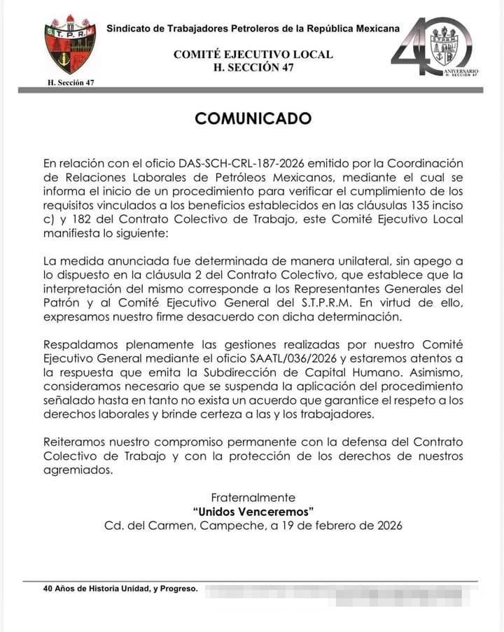 Denuncia al 9933989844… 🚩⚠️❗️¡Rechaza STPRM embestida de DAS Pemex por prestación de gasolina!; ante la embestida que la Dirección de Administración y Servicios (DAS) @Pemex de Marcela Villegas Silva puso en marcha para 2026 mediante un proceso de verificación estricta de la propiedad vehicular como requisito indispensable para justificar el pago de la prestación de gasolina, una medida que ha generado preocupación e inconformidad entre trabajadores activos y jubilados, el STPRM del Delfín de Deschamps, Ricardo Aldana Prieto, a través de las 36 secciones sindicales lanzó un boletín de rechazo a estas medidas, como el que publicó este pasado 19 de febrero 2026 la Secc 47 STPRM del títere José Antonio Toledo González y el cacique Víctor Matías Hernández Colunga, en el marco de su 40 Aniversario, en relación con el oficio DAS-SCH-CRL-187-2026 emitido por la Coordinación de Relaciones Laborales de @Pemex , mediante el cual se informa el inicio de un procedimiento para verificar el cumplimiento de los requisitos vinculados a los beneficios establecidos en las cláusulas 135 inciso c) y 182 del Contrato Colectivo de Trabajo (CCT). “La medida anunciada fue determinada de manera unilateral, sin apego a lo dispuesto en la cláusula 2 del CCT, que establece que la interpretación del mismo corresponde a los Representantes Generales del Patrón y al Comité Ejecutivo General (CEG) del STPRM”, reza el documento. “En virtud de ello expresamos nuestro firme desacuerdo con dicha determinación. Respaldamos plenamente las gestiones realizadas por el CEG mediante el oficio SAATL/036/2026 y estaremos atentos a la respuesta que emita la Subdirección de Capital Humano de Christopher Valenzuela Ponce). Asimismo, consideramos necesario que se suspenda la aplicación del procedimiento señalado hasta en tanto no exista un acuerdo que garantice el respeto a los derechos laborales y brinde certeza a las y los trabajadores”, agrega. atención @Claudiashein @MarcelaVilleg15 @CNE_Mex @SENER_mx @GobiernoMX @FGRmexico @LuzElena_GE @ASF_Mexico  @SCJN @STPS_mx @Tu_IMSS @SEMARNAT_mx @agencia_asea @CENAGAS_mx @IMPetroleo @SATMX @Hacienda_Mexico @BuenGobierno_mx @Centrofcrl #OIC #UIF #OmarReyesColmenares …Zas!!!