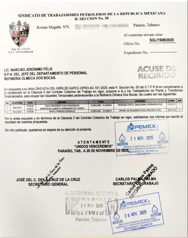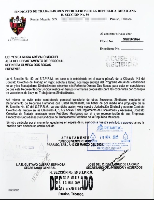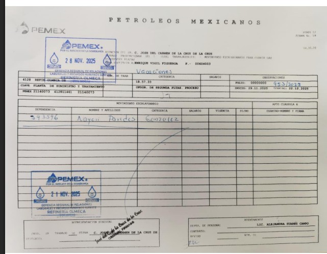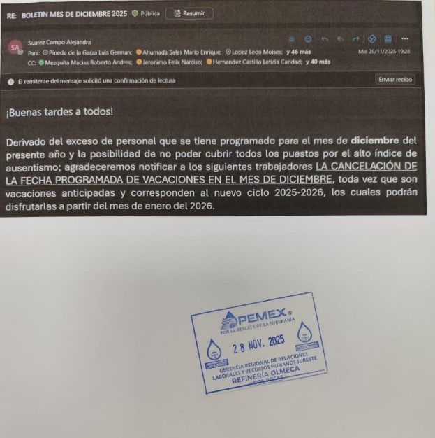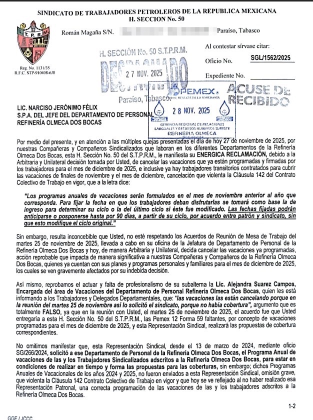Denuncia al 9933989844… 🚩⚠️🧑🏭‼️¡Refinería Olmeca, arbitraria cancelación de vacaciones y coberturas por RH; reclama Secc 50 STPRM!; en la refinería Olmeca en Paraíso, Tabasco, del gerente Julio César Aguilar Benítez, enfrenta una creciente tensión laboral luego de que trabajadores sindicalizados denunciaran la cancelación arbitraria de vacaciones ya programadas para finales de noviembre y el mes de diciembre 2025; la medida, impulsada desde el Departamento de Personal, ha provocado reclamaciones de la Sección 50 STPRM del cacique Gustavo Guerra y su títere José del Carmen de la Cruz de la Cruz, quienes acusan violaciones directas al Contrato Colectivo de Trabajo (CCT) vigente, omisiones administrativas y decisiones unilaterales que afectan a la plantilla laboral; de acuerdo con el oficio SGL/1562/2025, fechado el 27 de noviembre de 2025, el STPRM informa que la jefatura del Departamento de Personal decidió cancelar vacaciones ya firmadas y confirmadas en el sistema SIRHN, así como suspender contratos de trabajadores transitorios que habían sido programados para cubrir las ausencias; esta decisión, señalan, contraviene la Cláusula 142 del CCT, que establece que los programas anuales de vacaciones deben formularse en noviembre del año anterior, que su disfrute se basa en el ciclo correspondiente y que cualquier modificación solo puede realizarse mediante acuerdo entre la paraestatal y el sindicato petrolero, con un margen de hasta 90 días; la Sección 50 STPRM afirma que la cancelación desconoce además los acuerdos alcanzados el martes 25 de noviembre de 2025 en la oficina de la Jefatura de Personal; en esa reunión, de acuerdo al oficio SGL/1562/2025 fechado el 27 de noviembre de 2025, se pactó que la administración entregaría las @Pemex 12 Forma 59 faltantes correspondientes a las vacaciones de diciembre de 2025, para que el sindicato emitiera las propuestas de cobertura; sin embargo, a pesar de ese acuerdo, el departamento suspendió de manera unilateral los periodos ya programados, afectando la organización personal y familiar de los trabajadores; el sindicato también denuncia que la responsable del área de vacaciones, Alejandra Suárez Campos, informó a delegados y trabajadores que la cancelación se originó a petición del propio sindicato, bajo el argumento de que no existía cobertura suficiente; la Sección 50 califica esta versión como falsa y exige la apertura de una investigación administrativa en su contra por considerar que su conducta carece de probidad y honradez, además de generar confusión mediante una explicación que no corresponde a lo acordado previamente; los reclamos se agravan por una omisión que la Sección 50 describe como reiterada: la falta de entrega del Programa Anual de Vacaciones correspondiente a 2024 y 2025; según el oficio SG/266/2024, emitido el 13 de marzo de 2024, el sindicato solicitó de manera formal los programas para poder elaborar con anticipación las propuestas de cobertura; esa documentación nunca fue entregada, lo cual habría derivado en una inadecuada planificación por parte de la representación patronal y constituye una violación a la Cláusula 142; el conflicto también involucra la contratación de personal transitorio; el oficio SG/266/2024 advierte que el Departamento de Recursos Humanos ha incorporado trabajadores de otras secciones sindicales sin la propuesta previa de la Sección 50, lo que vulnera la jurisdicción sindical establecida en las Cláusulas 4, 5, 6 y en el Anexo 2 del Reglamento de Escalafones y Ascensos; pese a estos señalamientos, el propio registro interno de la refinería muestra que sí existían propuestas sindicales en curso, como las contenidas en el oficio SGL/1509/2025 del 20 de noviembre de 2025; en ese documento, el sindicato propone a Jesús Armando Puga Domínguez, Wenceslao Alberto Hernández del Carpio y Nayeli Paredes González para ocupar vacantes temporales de operario especialista y operador de plantas de proceso; mientras la estructura sindical insiste en que el desorden administrativo proviene de la falta de coordinación y transparencia del Departamento de Personal, la administración interna argumenta exceso de personal y riesgo de no poder cubrir todos los puestos durante diciembre; un correo electrónico interno señala que, debido al alto índice de ausentismo y al nuevo ciclo vacacional 2025-2026, se instruyó la cancelación de vacaciones anticipadas, con la indicación de que los trabajadores podrán tomarlas a partir de enero de 2026; la Sección 50 STPRM sostiene que esta determinación carece de sustento contractual y exige la reactivación inmediata de las vacaciones canceladas en el sistema SIRHN, incluyendo casos ya avalados, como el de la trabajadora Candelaria Reyes de la Cruz, con folio F-519692; el sindicato petrolero también solicita la entrega de todas los formato @Pemex 12 Forma 59 correspondientes a diciembre, así como una respuesta formal en los términos establecidos por la Cláusula 2 del CCT; el conflicto revela un deterioro en la relación laboral dentro de la refinería, marcada por decisiones unilaterales, omisiones administrativas y acusaciones mutuas sobre la responsabilidad en la cobertura de los puestos; con un cierre de año que combina alto ausentismo, presiones operativas y alta exposición pública del proyecto de la refinería Olmeca, la disputa entre la Sección 50 STPRM y el Departamento de Personal @Pemex se convierte en un nuevo foco de tensión que podría afectar la estabilidad laboral y operativa del complejo energético; la disputa se agrava cuando se observa que la Sección 50 había hecho gestiones formales con antelación para evitar justamente los problemas que hoy denuncia; en el oficio SG/266/2024, fechado el 13 de marzo de 2024, el sindicato solicitó al Departamento de Personal la entrega del Programa Anual de Vacaciones de las y los trabajadores sindicalizados de la refinería Olme