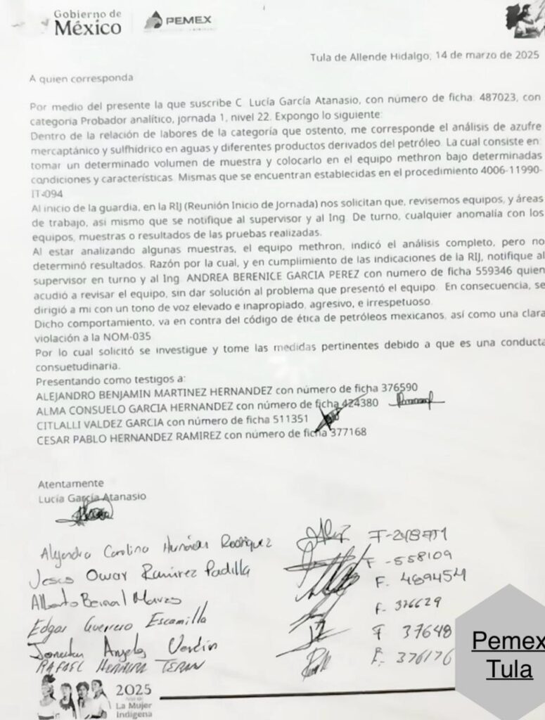 Denuncia al 9933989844…🚩⚠️ ¡ROBERTO MÉZQUITA batea doble, en la Olmeca y en Tula, con su incondicional ANDREA BERENICE!; de no creerse la mala praxis en el Sistema Nacional de Refinación (SNR) @Pemex donde los mandos están más preocupados en colocar a sus incondicionales que en la producción misma. Roberto Andrés Mézquita Macías resultó todólogo en @Pemex ya que prácticamente tiene bajo su mando dos refinerías, es gerente en Tula, Hidalgo, y está como SPA en la Gerencia del complejo Olmeca en Paraíso, Tabasco, por el maleta de Julio César Aguilar Benítez. Sin embargo, aunque aparentemente está ausente de la refinería en Tula maneja toda la estrategia a través de su trabajadora incondicional Andrea Berenice García Pérez, por lo que solo está de parapeto Juan Armando Pérez Hernández, quien quedó como SPA en Tula, quien proviene de la refinería en Salamanca, Guanajuato. Actualmente el esbirro de Roberto Andrés Mézquita Macías en Tula, Raymundo Acosta Chavarría, subgerente de Ingeniería de Procesos y Mejora Operativa, designó a Andrea Berenice García Pérez como coordinadora en la Superintendencia de Aseguramiento de la Calidad del Producto en Tula, siendo la que menor experiencia tiene de todos los ingenieros de confianza, y -como para echarle más crema a sus tacos- ella se jacta que próximamente ocupará el cargo de superintendente. El asunto es que tienen bien agarrado a Raymundo Acosta Chavarría ya que metió a sus hijos e incondicionales con ficha. Lo cierto es que todos los sindicalizados ya están cansados de la prepotencia y maltratos de Andrea Berenice García Pérez, ya que el SPA accede a todos los caprichos de Andrea Berenice García Pérez afectando derechos escalafonarios sindicales, así como el derecho de ascender a otras categorías, ya que ella pacta con el delegado sobre quiénes pasan y quiénes no. Lo peor es que hay quejas sobre estas conductas abusivas pero inexplicablemente no proceden y ahora nadie se atreve a enfrentarla ya que la funcionaria de marras asegura que Roberto Andrés Mézquita Macías ocupará el cargo que ostenta José Manuel Rocha Vallejo, subdirector de Producción de Petrolíferos. Como quedó plasmado en un oficio en el que Lucía García Atanasio (F-487023), con categoría de probador analítico, narra que en el análisis de azufre mercaptánico y sulfhídrico en aguas y diferentes productos derivados del petróleo, que consiste en tomar un determinado volumen de muestra y colocarlo en el equipo Methron bajo determinadas condiciones y características (establecidas en el procedimiento 4006-11990-IT-094) al inicio de la guardia, en la Reunión Inicio de Jornada (RIJ) les solicitaron revisar equipos y áreas de trabajo, asimismo que se notifique al supervisor y al ingeniero de turno, cualquier anomalía con los equipos, muestras o resultados de las pruebas realizadas, por lo que al estar analizando algunas muestras, el equipo Methron indicó el análisis completo, pero no determinó resultados, razón por la que -cumplimiento indicaciones de la RIJ- se notificó al supervisor en turno y a Andrea Berenice García Pérez (F-559346), quien acudió a revisar el equipo, sin dar solución al problema que presentó. “En consecuencia, se dirigió a mi con un tono de voz elevado e inapropiado, agresivo e irrespetuoso” (comportamiento que va en contra del código de ética de @Pemex así como una clara violación a la NOM-035) por lo cual la afectada solicitó se investigue y tome las medidas pertinentes debido a que es una conducta consuetudinaria. Queja que presentó con todo y testigos pero no pasó nada en contra de Andrea Berenice García Pérez. Autoridades deben investigar y sancionar. atención @Claudiashein @MarcelaVilleg15 @CNE_Mex @SENER_mx @GobiernoMX @FGRmexico @LuzElena_GE @ASF_Mexico  @SCJN @STPS_mx @Tu_IMSS @SEMARNAT_mx @agencia_asea @CENAGAS_mx @IMPetroleo @SATMX @Hacienda_Mexico @BuenGobierno_mx @Centrofcrl #OIC #UIF #OmarReyesColmenares …Zas!!!