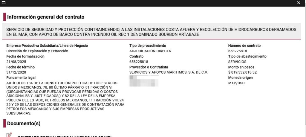 Denuncia al 9933989844… 🚩⚠️🚢 ¡SAM gana $1.9 MMDP en lo oscurito de Pemex con barcos de NAVIERA BOURBON!; en las sombras, @Pemex adjudicó sin licitación a Servicios y Apoyos Marítimos, representada por Carlos Raúl Angulo Crisanti, los contratos 658225818 para servicio de seguridad y protección contra incendio a las instalaciones costa afuera y recolección de hidrocarburos derramados en el mar, con apoyo de barco contra incendio Oil Rec 1, denominado Bourbon Artabaz por 819,332,818.32 pesos; y el contrato 658225817 por 1,088,128,280.12 pesos para servicio de seguridad y protección contra incendio, a las instalaciones costa afuera y recolección de hidrocarburos derramados en el mar, con apoyo de barco contra incendio Oil Rec 1, denominado Bourbon Alienor, que en conjunto suman más de 1,907 millones de pesos; ambos convenios tienen una vigencia del 21 de agosto de 2025 al 31 de diciembre de 2028; lo peor, es que estos 2 barcos (Bourbon Artabaz y Bourbon Alienor) aparecen en otros contratos ganados en @Pemex pero que pertenecen a Naviera Bourbon Tamaulipas (de ahí los nombres de las embarcaciones) de Gerardo Sánchez Schutz, lo que huele muy mal, razón por la que estos contratos no fueron registrados en el portal oficial de contrataciones de @Pemex , sino que aparecen en las bases de datos indexadas, sí públicas, pero no de fácil acceso; para colmo SAM y Naviera Bourbon han colaborado conjuntamente en propuestas para contratos, según indican documentos de @Pemex y tienen un domicilio similar en Tampico, Tamps; por ende, ya le habían adjudicado otros dedazos a SAM en @Pemex : el 21 de noviembre de 2024 el contrato 648224879 para servicios especializados de generación, transporte, acondicionamiento y recuperación de fluidos durante la perforación, terminación y reparación de pozos petroleros marinos, embarcación denominada Sábalo por 1,051,155,743.57 pesos vigente hasta el 7 de noviembre de 2027; también le asignaron a SAM en propuesta conjunta con Naviera Bourbon Tamaulipas el 21 de noviembre de 2024 sin licitación el contrato 648224878 para servicios especializados de generación, transporte, acondicionamiento y recuperación de fluidos durante la perforación, terminación y reparación de pozos petroleros marinos, embarcación denominada Concordia por 1,051,155,743.57 pesos con un plazo hasta el 7 de noviembre de 2027; asimismo, el 21 de agosto de 2024 le asignaron a SAM en @Pemex el contrato 648224823 para servicio de transporte de avituallamiento en contenedores refrigerados y secos a instalaciones costa afuera en el Golfo de México con abastecedor denominado San Rafael por 195,926,222.8 pesos, con plazo hasta el 30 de junio de 2027; además, @Pemex le adjudicó a SAM en propuesta conjunta con Naviera Bourbon Tamaulipas y QMAX México, el 1 de noviembre de 2023 el convenio 648222881 para servicios especializados de generación, transporte, acondicionamiento y recuperación de fluidos durante la perforación, terminación y reparación de pozos petroleros marinos, con apoyo de embarcación denominada Bourbon Explorer 509 por un monto de 821,478,815 pesos vigente hasta el 31 de diciembre; por lo que SAM suma ya 6 contratos -con los 2 más recientes- por un total de 5,027,177,623.38 pesos; atención @Claudiashein @MarcelaVilleg15 @CNE_Mex @SENER_mx @GobiernoMX @FGRmexico @LuzElena_GE @ASF_Mexico @SCJN @STPS_mx @Tu_IMSS @SEMARNAT_mx @agencia_asea @CENAGAS_mx @IMPetroleo @SATMX @Hacienda_Mexico @BuenGobierno_mx @Centrofcrl #OIC #UIF #OmarReyesColmenares …Zas!!!