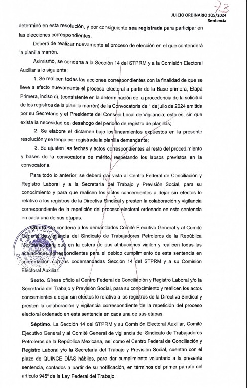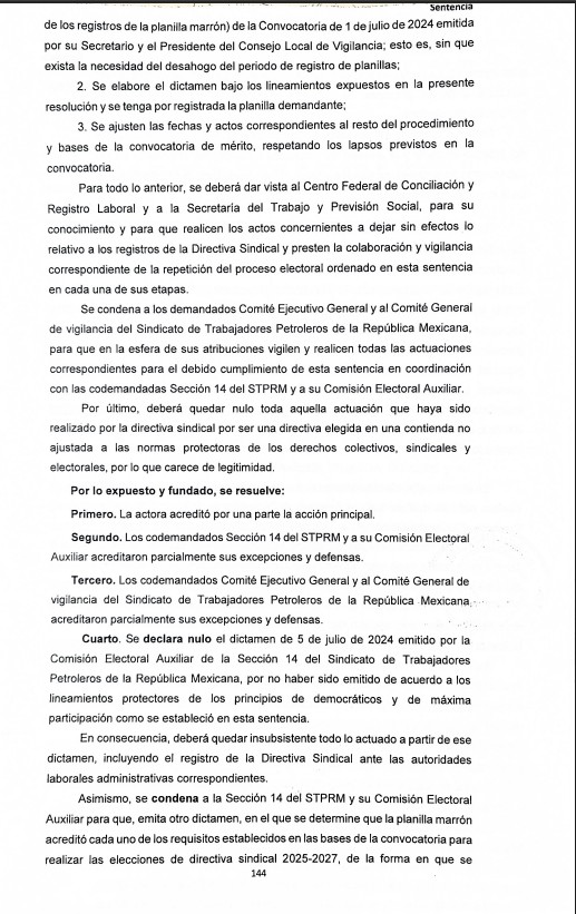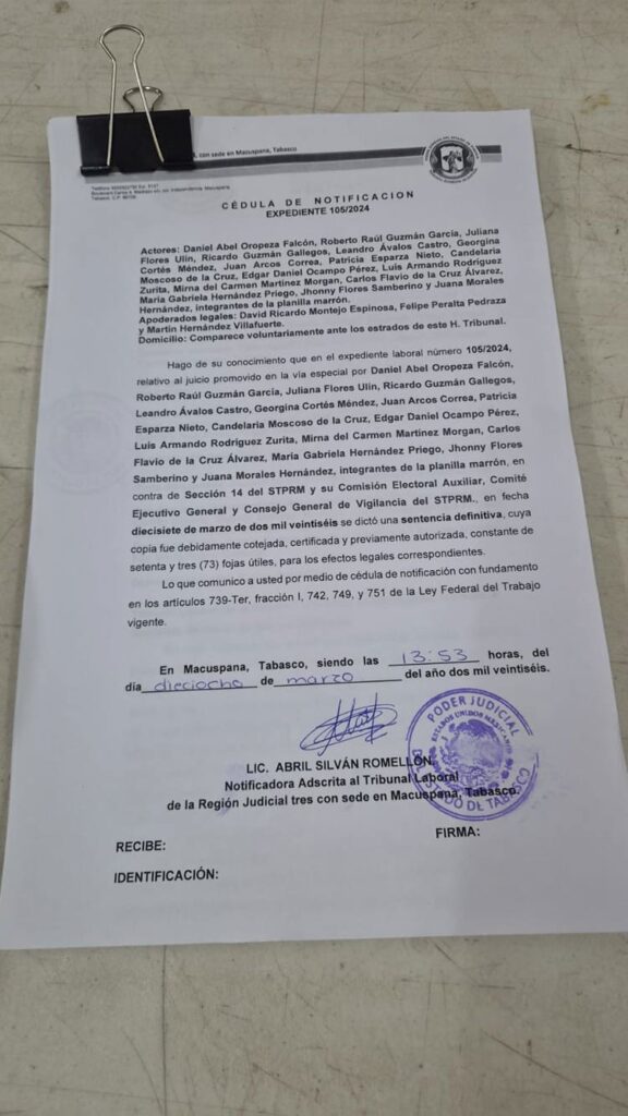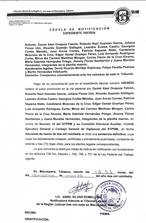 Denuncia al 9933989844… 🚩⚠️‼️ ¡SECC 14 STPRM: Tumban corona al cacique FRANCISCO BECERRA OCAÑA! El Tribunal Laboral de la Región 3, ubicado en Macuspana, Tabasco, ha determinado la nulidad del proceso de elección en la Sección 14 del STPRM del cacique Francisco Becerra Ocaña a la sombra de Raúl Francisco Becerra de Dios con base en Ciudad @Pemex . La sentencia, fechada el 18 de marzo de 2026 y correspondiente al juicio ordinario laboral 105/2024, fue emitida por el juez Alejandro Román Sánchez Pérez y autorizada por la secretaria instructora Karina Mireles Valay. Esta resolución judicial expone una serie de irregularidades que contravinieron los principios democráticos y de participación plena que deben regir la vida interna de los organismos sindicales, dejando sin efectos el dictamen del 5 de julio de 2024 que originalmente había validado la dirigencia cuestionada. La determinación del tribunal conlleva repercusiones inmediatas y severas para la actual administración sindical, ordenando la revocación del nombramiento de Francisco Becerra Ocaña como secretario general y desconociendo cualquier acto administrativo o registro derivado de aquella contienda viciada. La justicia federal determinó que la Comisión Electoral Auxiliar de la Sección 14 actuó de forma indebida al negar el registro a la planilla marrón, a pesar de que este grupo presentó documentación notarial que acreditaba el cumplimiento de los requisitos en los tiempos establecidos. El fallo judicial subraya que se vulneraron los estatutos y se intentó desacreditar injustamente a los opositores para perpetuar una estructura de poder que ahora carece de legitimidad legal. El proceso electoral para el periodo 2025-2027 deberá reponerse desde sus etapas iniciales, específicamente a partir de la determinación de procedencia del registro de la planilla demandante, sin necesidad de abrir nuevamente el periodo de inscripción para otros grupos. La planilla marrón, liderada por Daniel Abel Oropeza Falcón, deberá ser reconocida oficialmente para competir en igualdad de condiciones. Junto a Oropeza Falcón, el grupo de trabajadores que impulsó esta batalla legal incluye a Roberto Raúl Guzmán García, Juliana Flores Ulín, Ricardo Guzmán Gallegos, Leandro Ávalos Castro, Georgina Cortés Méndez, Juan Arcos Correa, Patricia Esparza Nieto, Candelaria Moscoso de la Cruz, Edgar Daniel Ocampo Pérez, Luis Armando Rodríguez Zurita, Mirna del Carmen Martínez Morgan, Carlos Flavio de la Cruz Álvarez, María Gabriela Hernández Priego, Jhonny Flores Samberino y Juana Morales Hernández. La defensa legal de los trabajadores estuvo a cargo de los abogados David Ricardo Montejo Espinosa, Felipe Peralta Pedraza y Martín Hernández Villafuerte. Por la parte demandada, el Comité Ejecutivo General y el Consejo General de Vigilancia del sindicato contaron con la representación de Gary Jorge Pérez Grijalva, León Eduardo Miceli Correzzola, Raúl Fernando Miceli Correzzola, Karina Paola Pérez García y Aldo Alberto Robles Espinoza. En tanto, la Sección 14 y su cuestionada Comisión Electoral Auxiliar fueron defendidas por un nutrido grupo de abogados, entre los que figuran Ángel Jesús Santamaría Pérez, Jorge Antonio Cedillo Moreno, Ricardo Martínez Martínez, Guillermo Santamaría Andrade, Victorio Chan Chan, Jhoana Torres López, Domingo Pérez Mayo, Rubén Rodríguez Pérez, Jazmín Cuenca Mendoza, Héctor Levi Morales Méndez y Flor María Perera Calderón. El cumplimiento de esta sentencia no queda a la libre voluntad de los actores involucrados, ya que el tribunal ha instruido al Centro Federal de Conciliación y Registro Laboral, así como a la Secretaría del Trabajo y Previsión Social, para que vigilen estrechamente cada paso de la reposición del proceso. Estas autoridades administrativas deben cancelar los registros de la directiva anterior y asegurar que el nuevo ejercicio democrático se ajuste estrictamente a la legalidad. La notificación del fallo, realizada por la notificadora Abril Silván Romellón, establece un plazo improrrogable de quince días hábiles para que el sindicato petrolero cumpla con lo ordenado. Este caso marca un precedente crítico sobre la supervisión judicial en las elecciones gremiales, evidenciando que la autonomía sindical no puede ser utilizada como escudo para atropellar los derechos de las minorías o ignorar los procesos legales establecidos. Atención @Claudiashein @MarcelaVilleg15 @CNE_Mex @SENER_mx @GobiernoMX @FGRmexico @LuzElena_GE @ASF_Mexico  @SCJN @STPS_mx @Tu_IMSS @SEMARNAT_mx @agencia_asea @CENAGAS_mx @IMPetroleo @SATMX @Hacienda_Mexico @BuenGobierno_mx @Centrofcrl #OIC #UIF #OmarReyesColmenares …Zas!!!