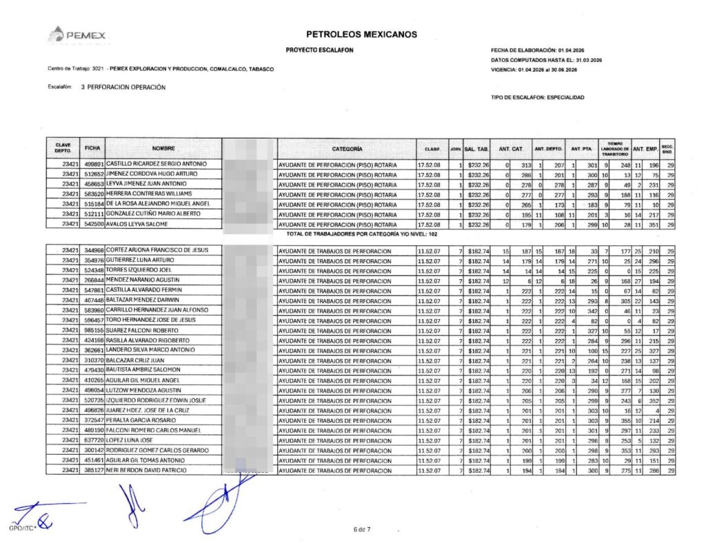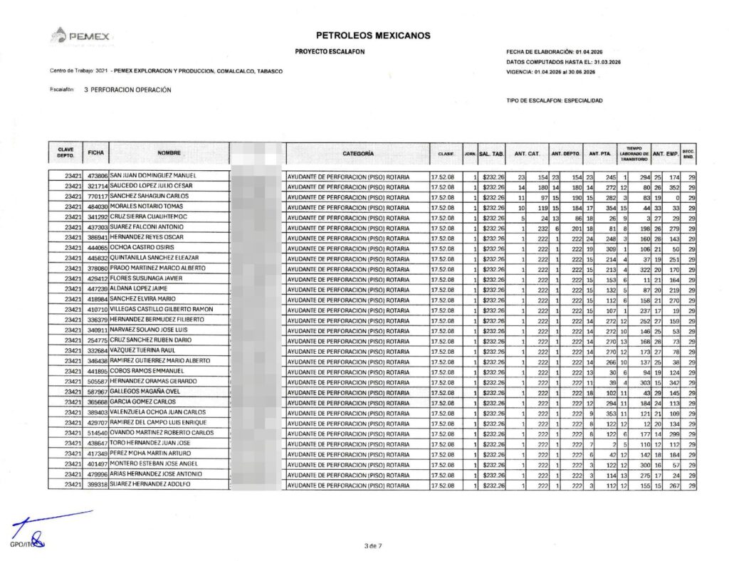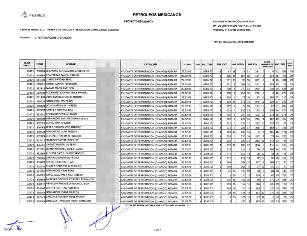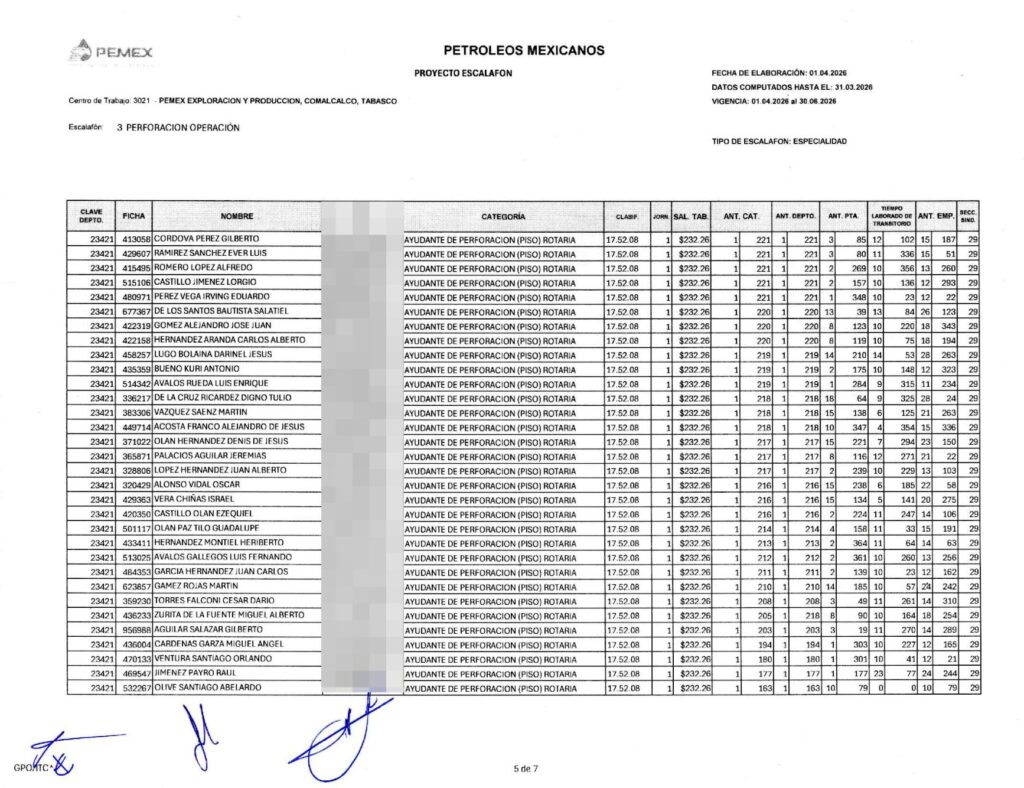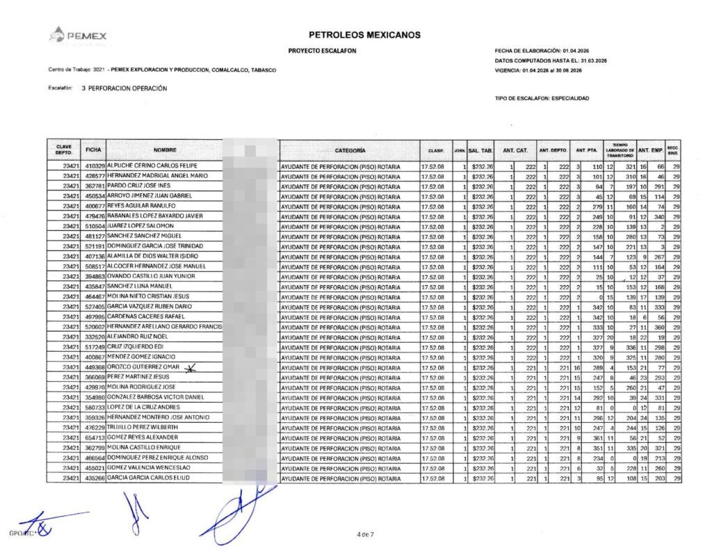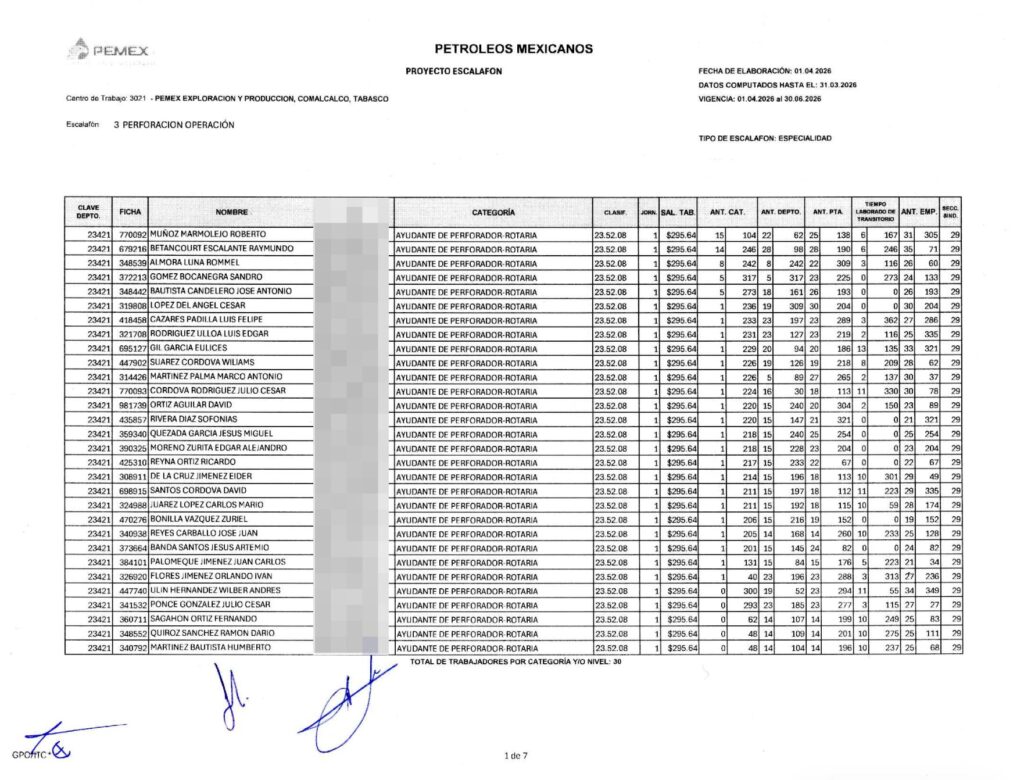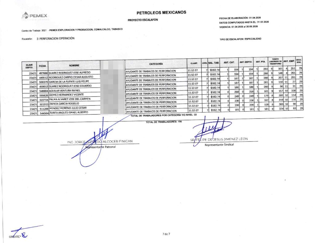 Denuncia al 9933989844… 🚩⚠️❗️¡SECCIÓN 29 STPRM: Por fin publican Escalafón Perforación y crean ola de inconformidades por violaciones laborales! Tras 2 años y medio, trabajadores de Perforación @Pemex en Comalcalco, Tabasco, de la Sección 29 STPRM del cacique Felipe de Jesús Jiménez León, por fin vieron publicado el Proyecto Escalafón con vigencia del 01 al 30 de abril 2026; sin embargo, se llevaron un fiasco, ya que salió perjudicado el personal de los departamentos de Mantenimiento, Reparación de Pozos y Perforación con un sin fin de anomalías, sobre todo violando la antigüedad de muchos. El cacique y sus esbirros -para lavarse las manos- le echan la culpa a Recursos Humanos @Pemex a cargo de Jorge Alfredo Alcocer Finigan, pero las firmas que aparecen de revisión y aceptación son de funcionarios de la Sección 29 STPRM, por lo que se espera que en los 45 días que tienen los trabajadores para poder reclamar se agolpen las inconformidades en la Secretaría de Estadísticas de la Sección 29 STPRM o vía el delegado departamental. La respuesta de las autoridades fue que “en la Gerencia de Relaciones Laborales y Recursos Humanos de Villahermosa, Tabasco, sí hizo un trabajo con la Comisión Mixta Nacional de Escalafones y quedaron todos de acuerdo cómo se aplicó el criterio para ordenar el escalafón de Perforación, Operación y Mantenimiento; sí Comalcalco hizo cambio les tendrá que rendir cuentas y dar explicaciones para poder solventar las inconformidades de los trabajadores”. Atención @Claudiashein @MarcelaVilleg15 @CNE_Mex @SENER_mx @GobiernoMX @FGRmexico @LuzElena_GE @ASF_Mexico @SCJN @STPS_mx @Tu_IMSS @SEMARNAT_mx @agencia_asea @CENAGAS_mx @IMPetroleo @SATMX @Hacienda_Mexico @BuenGobierno_mx @Centrofcrl #OIC #UIF #OmarReyesColmenares …Zas!!!