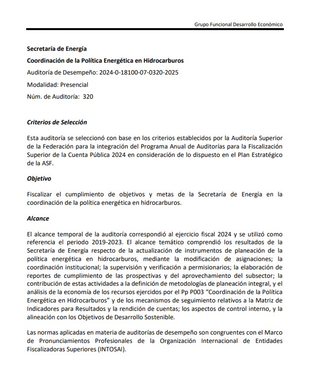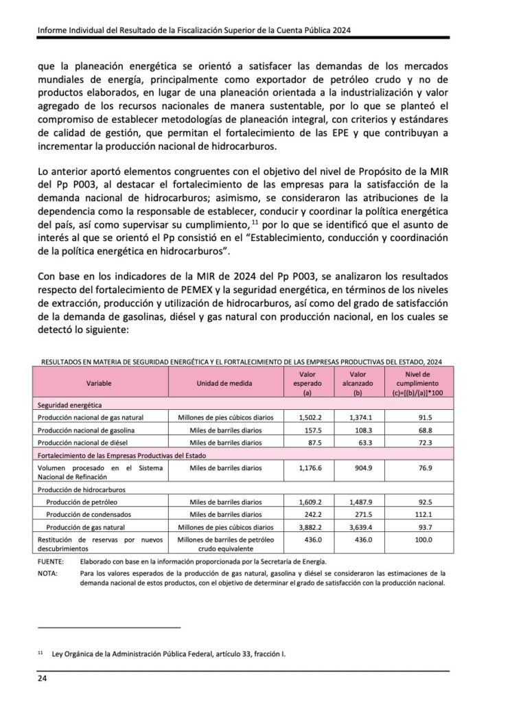 Denuncia al 9933989844… 🚩⚠️📉‼️¡SENER, deficiencia en producción y refinación provocó incumplimiento en Cuenta Pública 2024: Auditoría Superior de la Federación!; la Auditoría Superior de la Federación (ASF), mediante la Auditoría de Desempeño 2024-0-18100-07-0320-2025, fiscalizó la Cuenta Pública 2024 de la Secretaría de Energía (Sener), entonces en manos de Miguel Ángel Maciel Torres y ahora a cargo de Luz Elena González Escobar, detectando múltiples deficiencias en la supervisión, falta de documentación comprobatoria y el incumplimiento de metas de producción y soberanía energética dentro del Programa presupuestario P003 “Coordinación de la Política Energética en Hidrocarburos”; a pesar de que la dependencia ejerció un presupuesto de 156,644,461,500 pesos, cifra superior en un 7.6% al presupuesto original aprobado de 145,635,964,800 pesos, los resultados operativos mostraron inconsistencias y falta de certeza en la información reportada; del total de recursos ejercidos, el 99.91%, equivalente a 156,509,050,000 pesos, se destinó a gastos de inversión relativos a aportaciones patrimoniales para fortalecer las finanzas de @Pemex , en el último año de la desastrosa administración del Agrónomo, mientras que el 0.09% restante se utilizó para gasto corriente en la planeación y seguimiento de la política energética; en el rubro de instrumentos de planeación, la ASF identificó inconsistencias entre los métodos de cálculo y las acciones reportadas por la Sener, aunque la dependencia informó un cumplimiento del 100% en la modificación de asignaciones petroleras y revisión de normativa, se detectó que sus registros internos diferían de lo informado en la Cuenta Pública, específicamente, la Secretaría señaló la modificación de 364 títulos correspondientes a ejercicios anteriores para justificar sus indicadores, pero para el registro oficial solo consideró dos solicitudes presentadas por @Pemex : las asignaciones AE-0138-2M-Cuichapa y AE-0143-2M-Comalcalco; además, respecto a la emisión de opiniones sobre iniciativas de ley, de las 31 informadas, la documentación comprobatoria solo respaldó 16, evidenciando una falta de mecanismos de control para validar el desempeño reportado; la Auditoría también expuso debilidades en la formalización de procesos críticos, en la actualización de las asignaciones AE-0138-2M-Cuichapa y AE-0143-2M-Comalcalco se solicitó la opinión técnica de la Comisión Nacional de Hidrocarburos (CNH, ahora extinta), la cual fue parcial al no acreditarse el dictamen de los anexos 1 y 2 relativos a la ubicación y compromisos mínimos de trabajo; aunque la Sener emitió los nuevos títulos el 31 de mayo de 2024, no se comprobó la notificación de estos cambios a @Pemex ; asimismo, en la revisión del Plan Quinquenal de Expansión del Sistema de Transporte y Almacenamiento Nacional Integrado de Gas Natural, la Sener no documentó el 40% de las actividades asociadas con la emisión de comentarios y la atención de observaciones de sus unidades administrativas, lo que generó un área de oportunidad en la certeza del procedimiento; en materia de coordinación del subsector, la Sener reportó la realización de 24 actos de coordinación, cumpliendo la meta establecida; sin embargo, la Auditoría reveló que estas reuniones se acordaron de manera informal vía telefónica o por medios electrónicos, sin acreditar criterios para su calendarización; más grave aún, la evidencia documental proporcionada no incluyó los temas sustantivos abordados ni los acuerdos generados o medidas correctivas, limitándose la Sener a señalar que la información sustantiva se encontraba en otras áreas o dependencias; esto impidió comprobar la utilidad real de dichos actos para la definición de la política energética, derivando en recomendaciones para formalizar y documentar estos procesos; la supervisión de permisionarios presentó discrepancias significativas, ya que la Sener reportó la revisión de 504 reportes periódicos y 4 visitas de verificación, pero la documentación entregada a los auditores consistió en 510 reportes y 5 actas de verificación, mostrando inconsistencias en las cifras oficiales; además, los procedimientos internos para supervisar los reportes de refinación y procesamiento de gas resultaron estar desactualizados frente a la operación real; por ejemplo, debido al cambio de periodicidad a semanal, los reportes se enviaron por correo electrónico y no se elaboraron los oficios de prevención ni los dictámenes de evaluación estipulados en la normativa, careciendo la documentación de las firmas de los responsables de su elaboración y supervisión; el seguimiento a la productividad del subsector evidenció fallas en la calidad de la información; la ASF detectó que los cálculos proporcionados por la Sener no respaldaban las cifras de los reportes de balance de gas natural y producción de hidrocarburos. Por ejemplo, para el balance de enero de 2024, se utilizaron datos de 2022 y 2023 sin identificación clara. Los resultados productivos quedaron por debajo de las metas: el aprovechamiento de gas alcanzó el 92.0%, inferior a la meta del 98.0%; la producción de hidrocarburos líquidos fue de 1,748.4 miles de barriles diarios, un 6.1% menos de lo esperado; y la producción de gas natural fue de 3,529.8 millones de pies cúbicos diarios, un 21.0% por debajo de la meta; en términos de soberanía energética y fortalecimiento de las Empresas Productivas del Estado (EPE, ahora 1 sola paraestatal), los objetivos no se cumplieron en su totalidad; la producción nacional sólo alcanzó a cubrir el 68.8% de la demanda de gasolinas y el 72.3% de la demanda de diésel; el volumen procesado en el Sistema Nacional de Refinación (SNR) fue de 904.9 miles de barriles diarios, representando apenas el 76.9% del valor esperado de 1,176.6 miles de barriles diarios; la dependencia justificó estos re