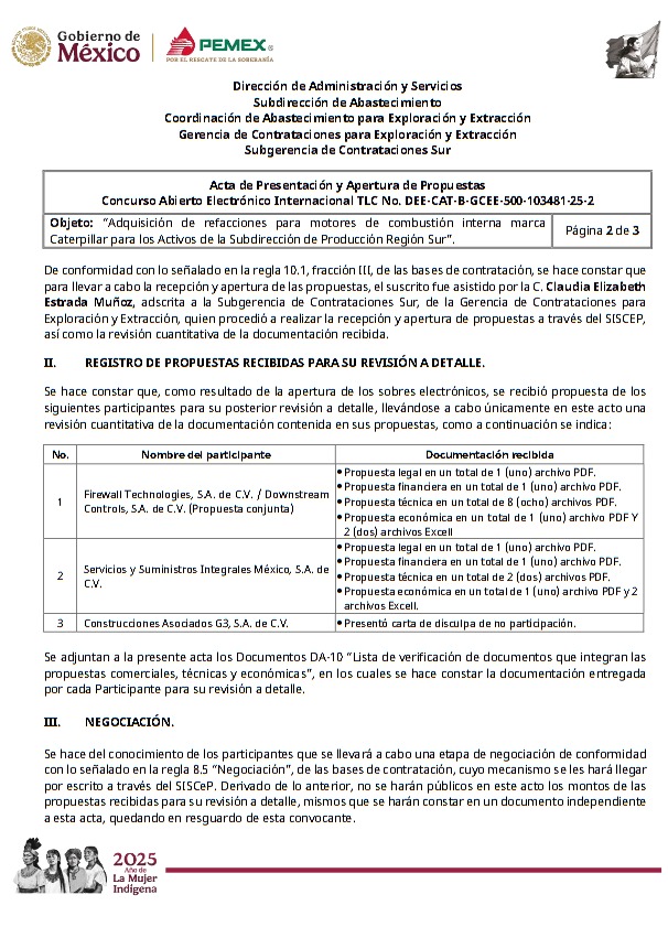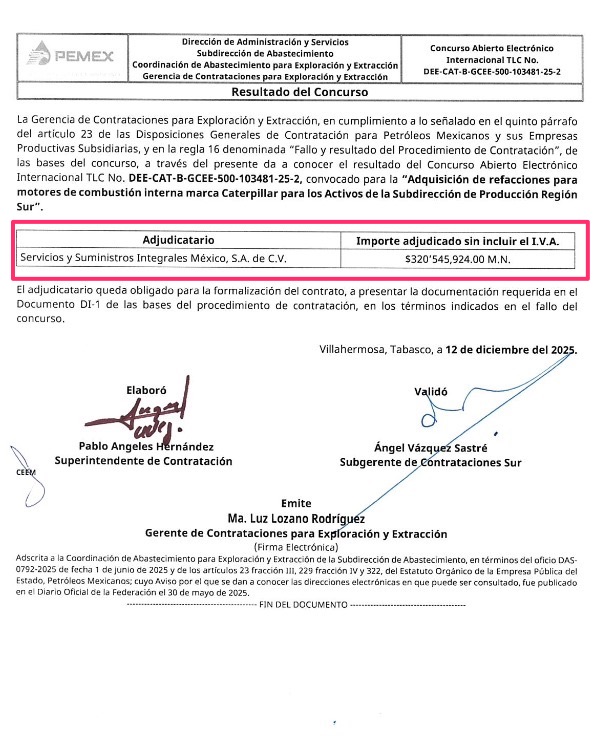 Denuncia al 9933989844… 🚩⚠️ ¡SSIMEX suma 320 MDP en Pemex en su 4 contrato como voraz intermediario!; Servicios y Suministros Integrales México (SSIMEX), representada en sus contratos por María Elena Villanueva Contreras y Leticia del Carmen Echavarría Jauregui, recibió su 4 contrato con @Pemex por 320,545,924 pesos como resultado de la adjudicación del concurso DEE-CAT-B-GCEE (Lucy Lozano Rodríguez) 500-103481-25-2 para adquisición de refacciones para motores de combustión interna marca Caterpillar para los Activos de la Subdirección de Producción Región Sur (SPRS ahora SERS) de Marcos Torres Fuentes, a un plazo hasta el 31 de diciembre de 2027, conforme a las bases del modelo de contrato. Lo que convierte a esta empresa en proveedor intermediario de equipos y suministros diversos a precio inflado por el cambio de mano con cargo a la petrolera nacional. En el Acta de Apertura de Propuestas de esta licitación, @Pemex ocultó ilegalmente los montos de los participantes Construcciones Asociados G3, y la propuesta conjunta de Firewall Technologies/ Downstream Controls, firmada por Lucy Lozano Rodríguez, gerente de Contrataciones para Exploración y Extracción; Ángel Vázquez Sastré, subgerente de Contrataciones Sur; y Pablo Ángeles Hernández, superintendente de Contratación. Con este contrato, SSIMEX suma 521,282,649.22 pesos, sumando otros 3 convenios (1 de EPN/Treviño, 1 de AMLO/Agrónomo y 2 vigentes hasta 2027 de Sheinbaum/Padilla): 1.- Contrato 653025603 para adquisición de montacargas, grúas verticales y articuladas, equipos para izaje y maniobras para los talleres y plantas de fluidos de la Gerencia de Operación y Mantenimiento de Equipos, vigente del 10 de julio de 2025 al 31 de diciembre de 2027 por un monto de 165,736,184.57 pesos. 2.- Contrato 648234001 para adquisición de polipastos para los talleres de @Pemex Exploración y Producción (PEP ahora DEE) que estuvo vigente del 27 de septiembre de 2024 al 28 de diciembre de 2024 por 10,511,431.96 pesos. 3.- Contrato 641008601 para suministros de aceites lubricantes industriales y automotrices nuevos para las áreas operativas de @Pemex Perforación y Servicios (SPMP) a un plazo del 3 de mayo al 28 de diciembre de 2018 por 24,489,108.69 pesos; atención @Claudiashein @MarcelaVilleg15 @CNE_Mex @SENER_mx @GobiernoMX @FGRmexico @LuzElena_GE @ASF_Mexico  @SCJN @STPS_mx @Tu_IMSS @SEMARNAT_mx @agencia_asea @CENAGAS_mx @IMPetroleo @SATMX @Hacienda_Mexico @BuenGobierno_mx @Centrofcrl #OIC #UIF #OmarReyesColmenares …Zas!!!