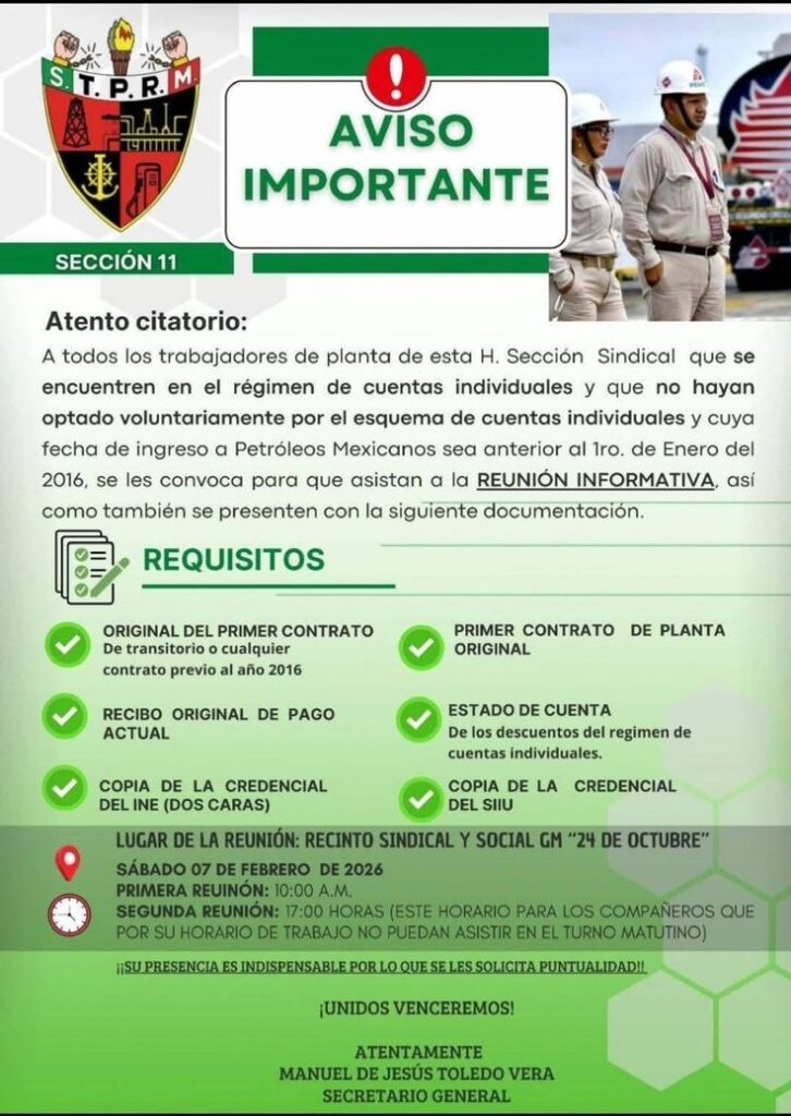 Denuncia al 9933989844… 🚩⚠️❗️¡STPRM: Atole con el dedo en Jubilaciones/Anexo 16 a trabajadores!; sigue el jaloneo por el Anexo 16 en el STPRM del Delfín de Deschamps, Ricardo Aldana Prieto, en donde al parecer sus agremiados ya comienzan a abrir los ojos ante la simulación de sus 32 dirigencias seccionales y la dirigencia nacional encabezada por El Delfín y el Comité Ejecutivo General (CEG) para regresar a los trabajadores petroleros -a quienes ya se les están aplicando descuentos- del esquema de cuentas individuales al de jubilación al que calificaron como “puro atole con el dedo”. Lo irónico del Anexo 16 es que quienes lo autorizaron ante @Pemex con Carlos Romero Deschamps a la cabeza en el sexenio de @EPN , incluido El Delfín y la mayoría de los actuales caciques seccionales, ahora busquen revertirlo. Mientras las dirigencias seccionales, como la Sección 11 STPRM del cacique Manuel de Jesús Toledo Vera de Nanchital, Veracruz, están pidiendo de nuevo documentación a los trabajadores petroleros, han aparecido publicaciones donde reclaman el engaño al respecto, como en la Sección 36 STPRM del cacique Juan Antonio Treviño Vega “El Borrachín” en Reynosa, Tamaulipas: “Los recientes criterios emitidos por los tribunales federales en materia laboral han dejado sin lugar a dudas que todo el personal sindicalizado de @Pemex , de planta o transitorio, tiene derecho a optar entre el régimen de jubilaciones y el esquema de cuentas individuales, conforme al Artículo 2 del Anexo 16 del Contrato Colectivo de Trabajo Vigente (CCTV). Este derecho no depende de la categoría laboral ni de interpretaciones discrecionales. A pesar de ello, nuevamente se solicita a la base trabajadora la entrega de documentación con el argumento de integrar una demanda colectiva, repitiendo un patrón ya conocido: requerir papeles, anunciar gestiones y posponer soluciones reales, mientras los descuentos continúan y el derecho a la jubilación se sigue diferiendo. No es la primera vez. En octubre del año pasado se pidió documentación similar con la promesa de regresar al esquema de jubilaciones. No hubo resultados concretos, sin embargo al personal que no les descontaban a raíz de esa documentación les empezaron a descontar cuando pensaban que ya los regresaban al régimen de jubilación y nada sucedió. Hoy se vuelve a pedir lo mismo, bajo una ruta que -por su propia naturaleza- es lenta, costosa y prolongada, y que no detiene de inmediato los descuentos ni restituye derechos. Los hechos son claros y verificables: trabajadores que promovieron acciones individuales ya obtuvieron resoluciones judiciales que ordenan la devolución de aportaciones, el cese de descuentos y el reconocimiento de su derecho a jubilarse cuando corresponda. Es decir, sí hay vías efectivas. La postergación no es inevitable. En los hechos, la estrategia anunciada no acelera la solución ni presiona a la empresa; por el contrario, administra el conflicto y compra tiempo, reproduciendo una dinámica que ya se vivió sin resultados. La consecuencia práctica es una sola: el derecho se enfría y el trabajador sigue pagando. Existen, además, mecanismos estatutarios con capacidad real de presión: la revisión del CCTV y, en su caso, los movimientos colectivos previstos en los artículos 12, 13 y 14 de los Estatutos, con votación democrática del 66% de los socios activos. Estas herramientas sí impactan de inmediato y sí obligan a la empresa a sentarse a resolver. La jubilación no es una dádiva ni un favor en trámite. Es un derecho contractual que ya fue confirmado por los tribunales. Seguir postergándolo mediante rutas que no dan resultados solo beneficia a quien no quiere resolver. a base trabajadora merece verdad, acciones eficaces y resultados, no promesas cíclicas”, reza el documento. atención @Claudiashein @MarcelaVilleg15 @CNE_Mex @SENER_mx @GobiernoMX @FGRmexico @LuzElena_GE @ASF_Mexico  @SCJN @STPS_mx @Tu_IMSS @SEMARNAT_mx @agencia_asea @CENAGAS_mx @IMPetroleo @SATMX @Hacienda_Mexico @BuenGobierno_mx @Centrofcrl #OIC #UIF #OmarReyesColmenares …Zas!!!