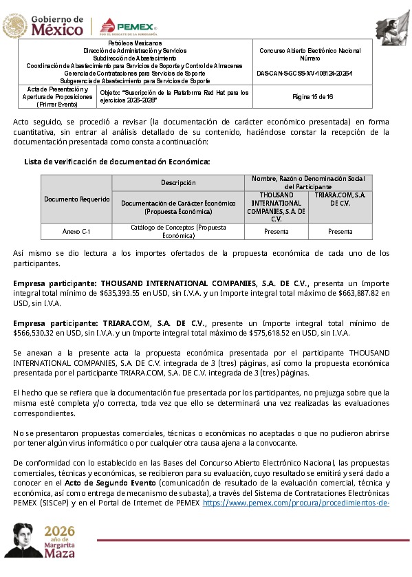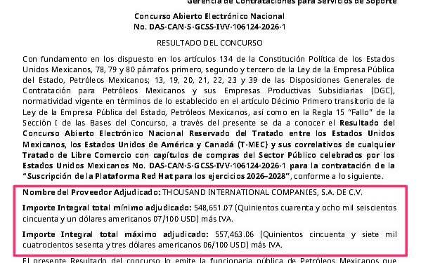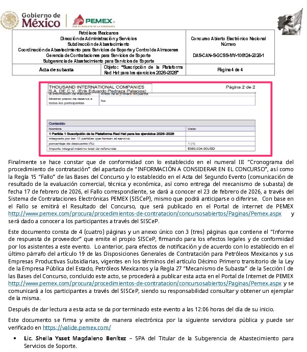 Denuncia al 9933989844… 🚩⚠️ ¡THOUSAND INTERNATIONAL COMPANIES: Gana subasta Pemex por 9.8 MDP! Thousand International Companies (TICSA), con 102 contratos con dependencias municipales y estatales principalmente de Monterrey, Nuevo León, recibió el fallo de la licitación DAS-CAN-S-GCSS (Norma Flores Garcés) IVV-106124-2026-1 de @Pemex por un monto de 9,829,372.99 pesos para ejecutar el servicio de suscripción de la Plataforma Red Hat para los ejercicios 2026–2028. La asignación fue el 23 de febrero de 2026 y fue firmada por Norma Flores Garcés, Gerente de Contrataciones para Servicios de Soporte (GCSS). En la apertura de propuestas ofertó Thousand International Companies propuso inicialmente 663,887.82 dólares que equivalen al tipo de cambio actual a 11,705,889.55 pesos, mientras que la empresa http://Triara.com propuso 566,530.32 dólares equivalentes a 9,989,249,92 pesos. Sin embargo, aunque la propuesta de Triara fue menor, @Pemex escogió a Thousand International y en una etapa de “subasta” la empresa bajó el monto hasta los 557,463.06 dólares que equivalen a los 9,829,372.99 pesos. Atención @Claudiashein @MarcelaVilleg15 @CNE_Mex @SENER_mx @GobiernoMX @FGRmexico @LuzElena_GE @ASF_Mexico @SCJN @STPS_mx @Tu_IMSS @SEMARNAT_mx @agencia_asea @CENAGAS_mx @IMPetroleo @SATMX @Hacienda_Mexico @BuenGobierno_mx @Centrofcrl #OIC #UIF #OmarReyesColmenares …Zas!!!