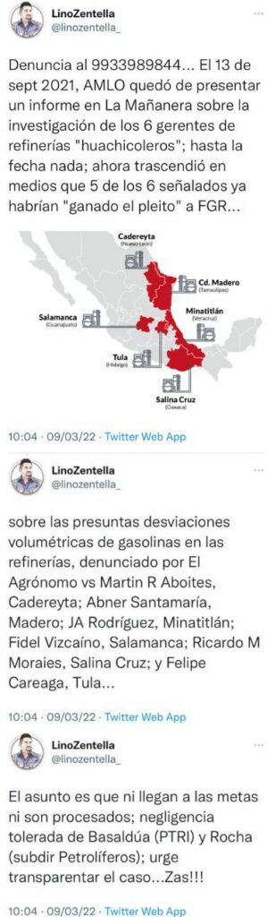 Denuncia al 9933989844… El 13 de sept 2021, AMLO quedó de presentar un informe en La Mañanera sobre la investigación de los 6 gerentes de refinerías “huachicoleros”; hasta la fecha nada; ahora trascendió en medios que 5 de los 6 señalados ya habrían “ganado el pleito” a FGR sobre las presuntas desviaciones volumétricas de gasolinas en las refinerías, denunciado por El Agrónomo vs Martin R Aboites, Cadereyta; Abner Santamaría, Madero; JA Rodríguez, Minatitlán; Fidel Vizcaíno, Salamanca; Ricardo M Moraies, Salina Cruz; y Felipe Careaga, Tula. El asunto es que ni llegan a las metas ni son procesados; negligencia tolerada de Basaldúa (PTRI) y Rocha (subdir Petrolíferos); urge transparentar el caso…Zas!!!