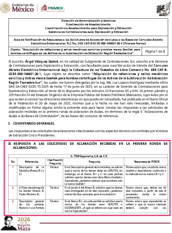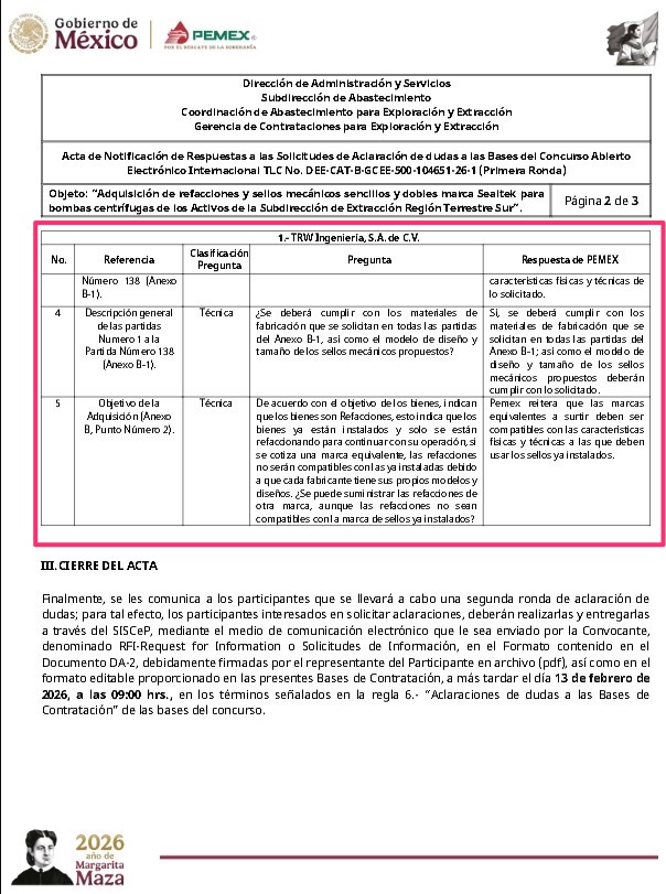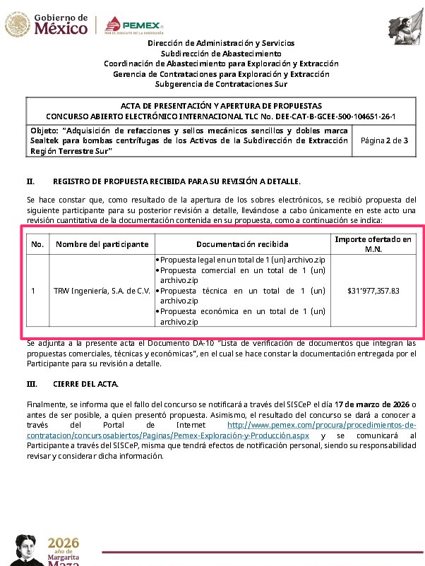 Denuncia al 9933989844… 🚩⚠️ 👉 ¡TRW: 2 Dedazo Pemex por 33.6 MDP para refaccionamiento SEALTEK con todo y trampas! La empresa yucateca TRW Ingeniería con beneficiarios a Nerio Román y Víctor Manuel Rueda Olán, Concepción Wiliam Pérez y Tessio Rea Tufiño, recibió el fallo de la licitación DEE-CAT-B-GCEE-500-104651-26-1 para la adquisición de refacciones y sellos mecánicos sencillos y dobles marca SEALTEK para bombas centrífugas de los Activos de la Subdirección de Extracción Región Terrestre Sur (SERTS) de José Luis Guzmán Almazo por 33,660,376.66 pesos. Sin embargo, desde el inicio del “concurso” estuvo cantado que este contrato sería suyo, ya que en la Apertura de Propuestas Económicas no sólo fue la única opción, sino que funcionarios de @Pemex le incrementaron el monto de la propuesta original de 31,977,357.83 pesos a 33,360,376.66 pesos en el fallo, es decir, le subieron 1,683,018.83 pesos más sin explicación alguna. Lo peor es que TRW Ingeniería intentó pasarse de listo y engañar con suministrar refacciones patito a la paraestatal. En las respuestas emitidas por @Pemex en la Primera Junta de Aclaraciones, TRW Ingeniería intentó cambiar a su favor el plazo de entrega de los bienes de 60 a 80 días naturales (pregunta 2), a lo que @Pemex se negó. Además aunque en el objetivo de las bases de esta licitación señala que “los bienes son refacciones SEALTEK”, TRW Ingeniería preguntó si podría suministrar las refacciones de otra marca, aunque las refacciones no sean compatibles con la marca de sellos ya instalados, derivado que @Pemex advierte que “se están refaccionando para continuar con su operación”; sin embargo, @Pemex rechazó la solicitud e insistió que “las marcas equivalentes a surtir deben ser compatibles con las características físicas y técnicas a las que deben usar los sellos ya instalados”. Con esta asignación, TRW Ingeniería firmó su segundo contrato con @Pemex para surtir refacciones SEALTEK (que en los hechos deben de supervisar para que no haga trampa en detrimento de @Pemex como lo anunció en el proceso concursal). El primero fue el 645004609 para adquisición de refacciones y sellos mecánicos sencillos y dobles marca SEALTEK para bombas centrífugas de los Activos de Producción Región Sur, que estuvo vigente del 02/08/2024 al 31/12/2024, por 27,980,423.00 pesos, por lo que suma en ambos 61,640,799.66 pesos: 1 con AMLO/Agrónomo y 1 con Sheinbaum/Padilla. Atención @Claudiashein @MarcelaVilleg15 @CNE_Mex @SENER_mx @GobiernoMX @FGRmexico @LuzElena_GE @ASF_Mexico @SCJN @STPS_mx @Tu_IMSS @SEMARNAT_mx @agencia_asea @CENAGAS_mx @IMPetroleo @SATMX @Hacienda_Mexico @BuenGobierno_mx @Centrofcrl #OIC #UIF #OmarReyesColmenares …Zas!!!