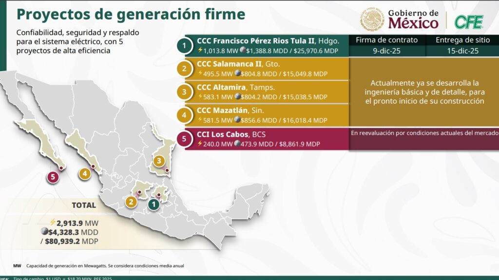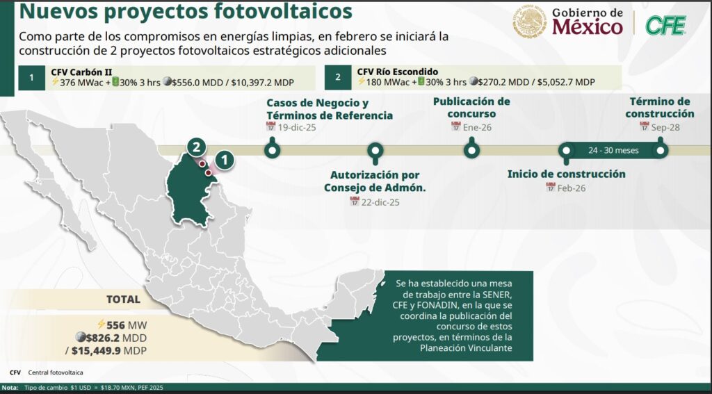 Denuncia al 9933989844… 🚩⚠️⚡️🧑‍🔧 ¡Va CFE por CCC, Complejos Fotovoltaicos, Infraestructura Eólica y 66 obras de Transmisión!; la Comisión Federal de Electricidad ( @CFEmx ) de Emilia Esther Calleja Alor presentó su hoja de ruta para ampliar la infraestructura de generación y transmisión eléctrica entre 2025 y 2030, con un paquete de proyectos prioritarios que contempla nuevas centrales de ciclo combinado, complejos fotovoltaicos, infraestructura eólica y 66 obras de transmisión que se distribuirán en varias etapas hasta 2026; entre los proyectos de generación firme se consideran cinco nuevas centrales de alta eficiencia que en conjunto aportarían 2,913.9 MW al Sistema Eléctrico Nacional, con una inversión estimada de 4,328.3 millones de dólares, equivalentes a 80,939.2 millones de pesos; destacan la CCC Francisco Pérez Ríos Tula II, en Hidalgo, con capacidad proyectada de 1,013.8 MW y un presupuesto de 1,388.8 millones de dólares; la CCC Salamanca II, en Guanajuato, con 495.5 MW y 804.8 millones; la CCC Altamira, en Tamaulipas, con 583.1 MW y 804.2 millones; la CCC Mazatlán, en Sinaloa, con 581.5 MW y 856.6 millones; y la CCI Los Cabos, en Baja California Sur, con 240 MW y 473.9 millones; todas se encuentran en desarrollo de ingeniería básica y de detalle para acelerar el inicio de construcción, aunque su avance dependerá de condiciones de mercado y procesos contractuales; el organismo federal también prevé concluir el que considera el complejo fotovoltaico más grande de Latinoamérica, ubicado en Puerto Peñasco; la meta es alcanzar 1,000 MW mediante la integración de nuevas fases. La Sección III, con 300 MW y almacenamiento de 90 MW por tres horas, prevé firma de contrato e inicio de obras entre el 22 y el 23 de diciembre de 2025, con apertura económica el 11 de diciembre y conclusión para diciembre de 2027; la Sección IV, con 280 MW y almacenamiento equivalente al 30% de la capacidad por tres horas, iniciaría obras en el primer trimestre de febrero de 2026 y concluiría en el primer trimestre de febrero de 2028; en conjunto suman 580 MW y una inversión de 710 millones de dólares, equivalentes a 13,277 millones de pesos; a la par, se anuncian dos nuevos complejos solares estratégicos que iniciarían construcción en febrero de 2026: Carbón II, con 376 MWac y almacenamiento del 30% por tres horas, e inversión de 556 millones de dólares; y Río Escondido, con 180 MWac y el mismo porcentaje de almacenamiento, e inversión de 270.2 millones; ambos proyectos, que totalizan 556 MW y 826.2 millones de dólares, cuentan con términos de referencia y casos de negocio listos para evaluación, y su desarrollo quedará sujeto a concursos públicos programados para 2026; la empresa también evalúa tres proyectos de energía limpia bajo esquema mixto -Las Garzas en Durango (270 MW), Los Girasoles en Quintana Roo (110 MW) y San Luis de la Paz en Guanajuato (63 MW)- en coordinación con la Secretaría de Energía y el FONADIN; estas iniciativas forman parte de un conjunto mayor de nueve propuestas presentadas por el fondo, aunque solo tres avanzan en mesas técnicas para definir características, gestiones previas y viabilidad; en materia de transmisión, se plantea una expansión agresiva con 66 proyectos distribuidos entre 2025 y 2026, cuya priorización se alineó a criterios de suministro con red completa, suministro con contingencia y descongestión operativa; para el cuarto trimestre de 2025 se consideran 22 obras, mientras en 2026 se programan 20 para el primer trimestre, tres para el segundo, 11 para el tercero y 10 para el cierre del año; el costo total ascendería a 1,916.4 millones de dólares, equivalentes a 35,836.8 millones de pesos, con esquemas de financiamiento OPF y FIBRA E; además del plan institucional, el Gobierno Federal presentó los resultados de la primera convocatoria pública para proyectos privados de generación eléctrica, realizada entre octubre y diciembre de 2025; este ejercicio, descrito como un mecanismo para agilizar permisos de generación e interconexión, redujo los tiempos de trámite promedio de ocho a 2.5 meses y reunió 98 propuestas que sumaron 13,614 MW para evaluación técnica; de ese total, 20 proyectos superaron todos los filtros regulatorios, ambientales, técnicos y de planeación, alcanzando una capacidad aprobada de 3,320 MW en generación y 1,488 MW en almacenamiento; la inversión global estimada asciende a 4,752 millones de dólares; los proyectos seleccionados, divididos en 15 fotovoltaicos y cinco eólicos, se reparten geográficamente en cinco regiones y 11 estados, con entradas en operación previstas entre diciembre de 2027 y julio de 2029; la región Peninsular concentra la mayor capacidad aprobada, con 1,419 MW y una inversión de 2,219 millones de dólares, seguida de la región Occidental con 701 MW y 861.4 millones, la Oriental con 520 MW y 785 millones, la Central con 440 MW y 527.2 millones, y la Noroeste con 240 MW y 358.6 millones; sin embargo, el despliegue real dependerá de la capacidad para ejecutar obras complejas en tiempos acotados, cumplir requisitos ambientales y sociales, asegurar financiamiento y despejar trámites administrativos que históricamente han ralentizado el crecimiento del sistema eléctrico nacional; aunque se presentan avances concretos, persisten interrogantes sobre la capacidad de integración de tantas obras simultáneas, el impacto real sobre la transición energética, la eficiencia económica de las nuevas centrales térmicas frente al impulso renovable, y la respuesta del mercado ante la reconfiguración regulatoria y técnica. El próximo año se anticipa una segunda convocatoria privada, lo que podría recalibrar el mapa energético nacional si se mantiene el ritmo y se consolidan los proyectos anunciados; atención @Claudiashein @MarcelaVilleg15 @CNE_Mex @SENER_mx @GobiernoMX @FGRmexico @LuzElena_GE @ASF_Mexico  @SCJN @STPS_mx @Tu_IMS
