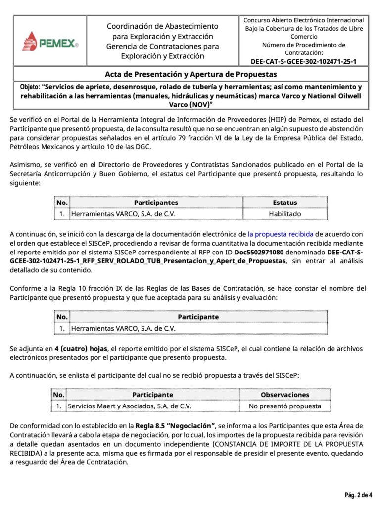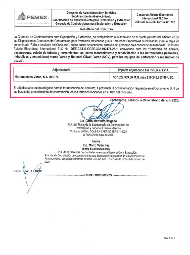 Denuncia al 9933989844… 🚩⚠️‼️¡VARCO: Octavo dedazo Pemex por 348 MDP a dirigente de CANACINTRA-Tabasco! Herramientas VARCO ha pactado en total 8 convenios con la paraestatal que suman 1,158 millones de pesos. De los pocos empresarios especiales de @Pemex y miembro de la élite de aplaudidores de la #4T -hay entrevistas recientes en medios que dan cuenta de esto- es Alejandro Yesugai Frías Díaz, quien como presidente de la Cámara Nacional de la Industria de la Transformación (Canacintra) en Tabasco, en su segundo periodo consecutivo 2026-2027, sigue firmando millonarios contratos con Herramientas VARCO ante @Pemex , mientras la mayoría de las empresas de ese estado tienen fuertes problemas financieros esperando pagos de la petrolera nacional que los tiene en quiebra técnica. Este pasado 9 de febrero le adjudicaron el Concurso Abierto Electrónico Internacional TLC No. DEE-CAT-S-GCEE-302-102471-25-1 para servicios de apriete, desenrosque, rolado de tubería y herramientas; así como mantenimiento y rehabilitación a las herramientas (manuales, hidráulicas y neumáticas) marca VARCO y National Oilwell VARCO, para los equipos de perforación y reparación de pozos, evidentemente direccionado por marca, por 57,829,389 pesos + 16,246,757 dólares (unos 290,682,102.29 pesos aproximadamente), que suman en total 348,511,491.29 pesos. Fallo firmado por los funcionarios Darío Martínez Delgado y Mario Valle Paz, cuando estaba como SPA de la Gerencia de Contrataciones para Exploración y Extracción (GCEE). Lo peor es que ya ni los modos cuidan ya que el dedazo se consumó desde el principio ya que Herramientas VARCO participó sola y @Pemex indebidamente ocultó los montos económicos en la Apertura de Propuestas. Mientras Alejandro Yesugai Frías Díaz enarbola la frase: “el mejor proyecto que puedes llevar a cabo es con el dinero que no es tuyo” (entrevista en la @XEVATabasco el pasado 30 de noviembre de 2025) y acepta que @Pemex aún tiene adeudos con varios proveedores, su empresa Herramientas VARCO lleva ya acumulados 1,158,867,422.76 pesos en 8 contratos firmados con Pemex: 1 contrato (423012803) con Calderón/Coppel, 1 contrato por Adjudicación Directa (424043825) con EPN/Treviño, 5 contratos con AMLO/Agrónomo (643021802, 643021803, 643022800, 643023828 y 643023829) de los que el 643021802 y 643021803 fueron por dedazo también y el más reciente con Sheinbaum/Padilla, donde participó indebidamente sin competencia. Hasta el tono de voz les cambió a varios dirigentes empresariales de Campeche, Tabasco, Veracruz y Tamaulipas, de 2024 a la fecha, del reclamo al aplauso, después de recibir sendos contratos millonarios. Los contratos de Herramientas VARCO -todos por el mismo concepto de trabajo (VARCO)- son: 1.- Contrato 643023829 para servicios de apriete, desenrosque, rolado de tubería y herramientas; así como mantenimiento y reparación mayor a las herramientas (manuales, hidráulicas y neumáticas), y equipos marca VARCO y National Oilwell VARCO, para los equipos de perforación y reparación de pozos (Paquete 1 Región Sur), vigente del 21/12/2023 al 30/06/2025, por 100,797,136.9 pesos. 2.- Contrato 643023828 para servicios de apriete, desenrosque, rolado de tubería y herramientas; así como mantenimiento y reparación mayor a las herramientas (manuales, hidráulicas y neumáticas), y equipos marca VARCO y National Oilwell VARCO, para los equipos de perforación y reparación de pozos (Paquete 2 Región Norte), vigente del 21/12/2023 al 30/06/2025, por 141,348,346.3 pesos. 3.- Contrato 643022800 para servicio integral para manejo, apriete, desenrosque y rolado de tubería y herramienta de perforación de pozos petroleros marinos, vigente del 24/01/2022 al 31/12/2023, por 129,344,252.5 pesos. 4.- Contrato 643021803 para servicios de apriete, desenrosque, rolado de tubería y herramientas; así como mantenimiento y reparación mayor a las herramientas (manuales, hidráulicas y neumáticas) y equipos marca VARCO y National Oilwell VARCO (NOV), para los equipos de perforación y reparación de pozos (Paquete 2: Región Norte) vigente del 24/11/2021 al 12/06/2022, asignado por Adjudicación Directa por 69,367,676.6 pesos. 5.- Contrato 643021802 para servicios de apriete, desenrosque, rolado de tubería y herramientas; así como mantenimiento y reparación mayor a las herramientas (manuales, hidráulicas y neumáticas), y equipos marca VARCO y National Oilwell VARCO (NOV), para los equipos de perforación y reparación de pozos (Paquete 1: Región Sur), vigente del 24/11/2021 al 12/06/2022, asignado por Adjudicación Directa por 171,106,936 pesos. 6.- Contrato 424043825 para servicio de mantenimiento y reparación mayor a las herramientas hidráulicas, neumáticas y herramientas manuales marca VARCO BJ que operan en los equipos de perforación y reparación de pozos a cargo de la unidad de negocio de perforación, vigente del 27/09/2013 al 30/06/2022, asignado por Adjudicación Directa por 142,035,229.8 pesos. 7.- Contrato 423012803 para trabajo integral para manejo, apriete, desenrosque y rolado de tubería y herramientas de perforación de la unidad de negocio de perforación, vigente del 15/08/2012 al 31/12/2014, por 56,356,353.37 pesos. Y el contrato 8 es el más reciente. Atención @Claudiashein @MarcelaVilleg15 @CNE_Mex @SENER_mx @GobiernoMX @FGRmexico @LuzElena_GE @ASF_Mexico @SCJN @STPS_mx @Tu_IMSS @SEMARNAT_mx @agencia_asea @CENAGAS_mx @IMPetroleo @SATMX @Hacienda_Mexico @BuenGobierno_mx @Centrofcrl #OIC #UIF #OmarReyesColmenares …Zas!!!