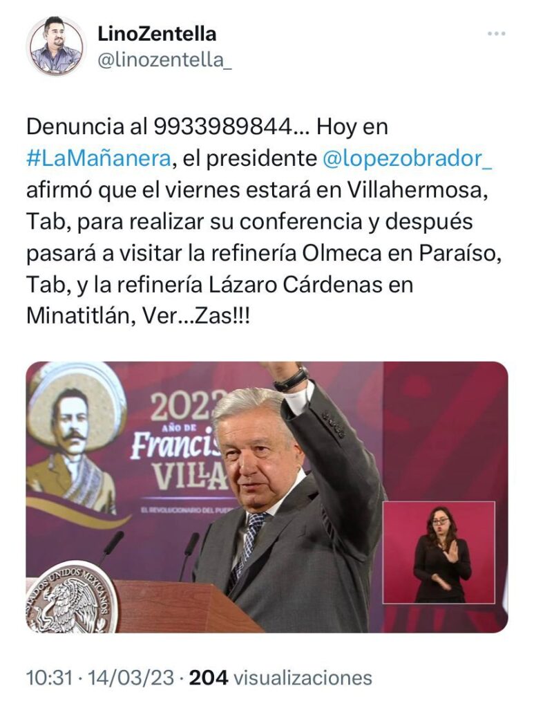 Denuncia al 9933989844… Hoy en #LaMañanera, el presidente @lopezobrador_ afirmó que el viernes estará en Villahermosa, Tab, para realizar su conferencia y después pasará a visitar la refinería Olmeca en Paraíso, Tab, y la refinería Lázaro Cárdenas en Minatitlán, Ver…Zas!!!