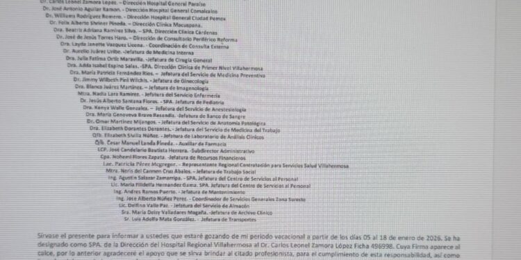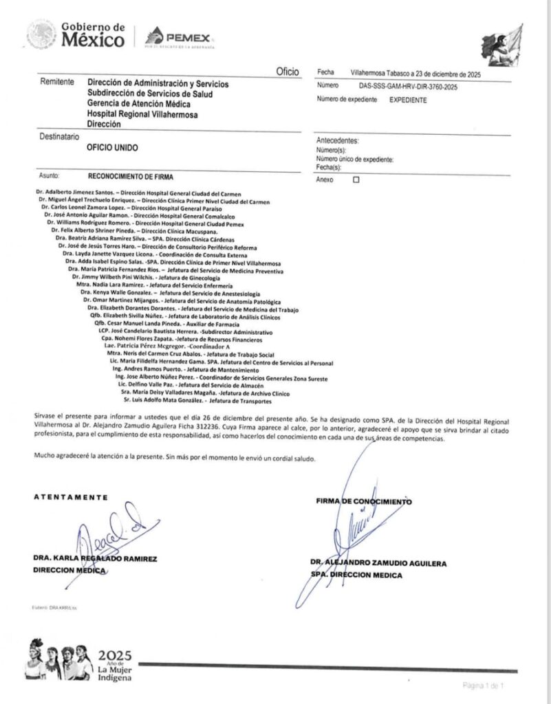 Denuncia al 9933989844… 🚩⚠️🚔 ¡ZAMUDIO huele a cárcel; ZAMORA, SPA Dirección del HRV Pemex por vacaciones de REGALADO!; este 2026, en plena temporada de Reyes Magos, la directora del Hospital Regional Villahermosa, Tabasco, @Pemex (HRV), llamado también “El Hospital del Terror”, Karla Regalado Ramírez, mediante el oficio DAS-SSS-GAM-HRV-DIR 3856-3025, liberado el mero 31 de diciembre 2025, dejó al frente por “vacaciones” del 05 al 18 de enero como SPA a su similar Carlos Leonel Zamora López, quien es director del Hospital General @Pemex en Paraíso, Tabasco; el asunto aquí es que lo “normal” sería que hubiere quedado en su lugar como SPA el subdirector médico del HRV, Alejandro Zamudio Aguilera (F-312236), como sucedió con el oficio anterior a este con número DAS-SSS-GAM-HRV-DIR-3760-2025, liberado el 23 de diciembre 2025, cuando Regalado se ausentó 3 días; la razón es que le están cuidando la espalda a Zamudio, quien está bajo investigación por acoso sexual por parte de la Fiscalía General de la República (FGR) interpuesta por la responsable del Banco de Sangre, por lo que casi no llega a trabajar y cuando llega se la pasa escondido en su oficina por miedo a que lo detengan; mientras todo esto sucede, los derecho habientes son los que pagan los platos rotos por toda esta inoperancia directiva en medio de una crisis financiera en este nosocomio desde el sexenio pasado; no hay para cuando habiliten el laboratorio clínico que ya tiene semanas cerrado, entre un sin fin de anomalías por falta de insumos médicos, medicinas, cirugías, mantenimiento a equipos e instalaciones, pagos a proveedores y más; atención @Claudiashein @MarcelaVilleg15 @CNE_Mex @SENER_mx @GobiernoMX @FGRmexico @LuzElena_GE @ASF_Mexico  @SCJN @STPS_mx @Tu_IMSS @SEMARNAT_mx @agencia_asea @CENAGAS_mx @IMPetroleo @SATMX @Hacienda_Mexico @BuenGobierno_mx @Centrofcrl #OIC #UIF #OmarReyesColmenares …Zas!!!