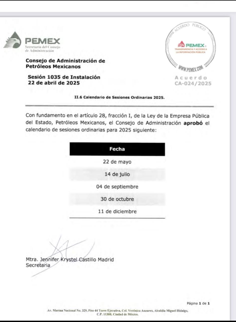 Denuncia al 9933989844… 🚩⚠️ ¡11 Diciembre, última sesión del CAPEMEX; removerían a CID!; la última sesion del Consejo de Administración de @Pemex (CAPEMEX) en 2025 será el próximo 11 de diciembre, luego de que en la Sesión 1035 de Instalación del pasado 22 de abril se formalizó el calendario de Sesiones Ordinarias, mediante el Acuerdo CA-024/2025, misma que signó Jennifer Krystel Castillo Madrid, en calidad de secretaria; el asunto, es que nuevamente trascendió que en la próxima y última sesión podría formalizarse la remoción de Ángel Cid Munguía, director de Exploración y Extracción (DEE) antes @Pemex Exploración y Producción (PEP), veremos si cuaja la versión;atención @Claudiashein @MarcelaVilleg15 @CNE_Mex @SENER_mx @GobiernoMX @FGRmexico @LuzElena_GE @ASF_Mexico @SCJN @STPS_mx @Tu_IMSS @SEMARNAT_mx @agencia_asea @CENAGAS_mx @IMPetroleo @SATMX @Hacienda_Mexico @BuenGobierno_mx @Centrofcrl #OIC #UIF #OmarReyesColmenares …Zas!!!