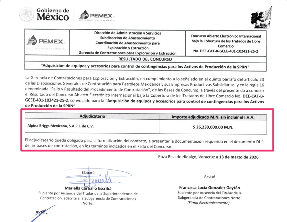Denuncia al 9933989844… 🚩⚠️ ¡ALPINA BRIGGS MEXICANA: Contrato Pemex por 26 MDP a PANIVINO, ligado a Bahamas Leaks! Jaime Hernández Panivino, quien fue vinculado en la investigación internacional conocida como Bahamas Leaks en 2016, por su participación en estructuras offshore usadas para mover dinero hacia paraísos fiscales producto de contratos previos con @Pemex , recibió un contrato con su empresa Alpina Briggs Mexicana por 26,230,000.00 pesos como resultado del fallo de la licitación DEE-CAT-B-GCEE-401-102421-25-2 para la adquisición de equipos y accesorios para control de contingencias para los Activos de Producción de la SPRN ahora SETRN, y que conforme al modelo de contrato, estará vigente hasta el 31 de diciembre de 2027. En la apertura de propuestas @Pemex ocultó los montos de ALPINA y Grupo MARSAN de México que fue la única competencia. Además durante la segunda ronda de aclaraciones de respuestas a dudas del concurso, ALPINA logró que le modificara @Pemex a su favor conceptos relacionados al Anexo C del concurso toda vez que @Pemex no respondió negativamente a ninguno de los cuestionamientos en las respuestas económicas. El fallo del concurso fue firmado por los funcionarios Mariella Carballo Escribá y Francisca Lucía González Gaytan de la Gerencia de Contrataciones para Exploración y Extracción. Con este nuevo convenio queda demostrado que aunque PANIVINO haya participado en una evasión fiscal conforme a los documentos resultantes de la filtración publicada por el diario alemán Süddeutsche Zeitung, retomado por la revista @proceso y compartido al Consorcio Internacional de Periodistas de Investigación (ICIJ, por sus siglas en inglés) en 2016 sobre los Bahamas Leaks, @Pemex siguió contratándolo -violando la Debida Diligencia del Jurídico- vía su empresa Alpina Briggs Mexicana. En los registros de la base de datos de contratos de @Pemex sólo hay disponible a consulta un contrato más del periodo AMLO/Agrónomo, el 644013811 por un monto de 30,913,913.25 pesos para adquisiciones de equipos y accesorios para control de contingencias ambientales en los Activos de Producción de la Región Norte de PEP ahora DEE, que estuvo vigente del 17 de febrero de 2023 al 31 de diciembre de 2024. Atención @Claudiashein @MarcelaVilleg15 @CNE_Mex @SENER_mx @GobiernoMX @FGRmexico @LuzElena_GE @ASF_Mexico @SCJN @STPS_mx @Tu_IMSS @SEMARNAT_mx @agencia_asea @CENAGAS_mx @IMPetroleo @SATMX @Hacienda_Mexico @BuenGobierno_mx @Centrofcrl #OIC #UIF #OmarReyesColmenares …Zas!!!
