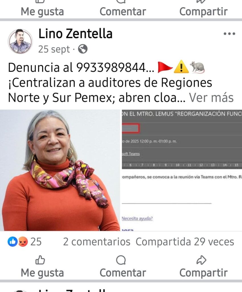 Denuncia al 9933989844…🚩⚠️‼️💸 ¡Capricho de 21 MDP movilización de auditores Pemex (Sur y Norte) a la CDMX!; en seguimiento a la nota publicada aquí el 25 de septiembre, resulta que la movilización en la Auditoría Interna de @Pemex en contubernio con Recursos Humanos fechada para el 6 de octubre pasado fue aplazada debido a que la petrolera nacional no cuenta con el presupuesto para realizar el desplazamiento de todo el personal auditor de las Subgerencias de Auditoría Regional Norte y Sur (la primera con sede en el Edificio Inteligente en Coatzacoalcos, Ver, y la otra en San Rafael Guadalupe, NL); sin embargo, la auditora interna Rosa María Gutiérrez Rodríguez y el gerente de Auditoría de Procesos Industriales, Transformación Energética, Comercialización y Logística, Raúl Gerardo Lemus Soto (cercano a Genaro García Luna, preso en Estados Unidos por corrupción en el sexenio de Felipe Calderón), continúan con la necedad y capricho de mover a 20 auditores a la CDMX para que sea más difícil realizar auditorias y detectar irregularidades en los centros de trabajo cercanos a las Subgerencias de Auditoría Regional Norte y Sur, lo que evidencia la corrupción y falta de transparencia en el ejercicio de recursos públicos y su fiscalización en contrataciones muy importantes para el Gobierno Federal en las refinerías de Tula, Salamanca, Madero y Cadereyta; los complejos procesadores de gas Burgos y Matapionche, así como los ductos y logística de la Zona Norte; mientras que la Región Sur ya no tendrá representación en las refinerías Salina Cruz y Minatitlán; los complejos procesadores de gas Cactus, Nuevo @Pemex , Ciudad @Pemex , La Venta y Coatzacoalcos; así como los complejos petroquímicos Cangrejera, Morelos y Cosoleacaque, incluyendo ductos y logística de esa zona, en total: 6 refinerías, 9 CPG, 70 TAD, 10 puertos y 15 mil km de ductos; movilización del personal que costaría más de 21 millones de pesos cuando @Pemex -en crisis financiera- tiene otras prioridades (monto que se filtró de RH que especifica el costo de la estructura más lo que incluye la movilización de los auditores da esa cantidad), que contraviene las Políticas y Lineamientos de Austeridad Republicana cifra que se incrementaría cuando los 20 auditores movilizados a la CDMX realicen recorridos de auditorías en las Zonas Norte y Sur a quienes les pagarían viáticos como avión, comidas y hospedaje; las razones para esta movilización residen en los 2 consentidos traídos del @Tu_IMSS , José Roberto Flores Bañuelos y Alejandro Sánchez Ruiz, quienes acaban de ser contratados y designados como subgerentes en Regiones Norte y Sur, por lo que desconocen el monstruo que es @Pemex y liquidaron a trabajadores que sí tenían el conocimiento, quienes por intereses personales no quieren moverse a sus centros de trabajo (Guadalupe, NL, y Coatzacoalcos, Ver) ya que residen en la CDMX y por capricho de estos 2 allegados a la nueva auditora interna, Rosa María Gutiérrez Rodríguez, pretenden justificar la millonaria movilización de 20 personas a la CDMX, afectando a los auditores con sus familias, patrimonio y estado de salud, bajo amenaza de liquidación sin importar la antigüedad y derechos laborales; esto porque la auditora interna, Rosa María Gutiérrez Rodríguez, está bien parada con Raquel Buenrostro Sánchez, titular de la Secretaría Anticorrupción y Buen Gobierno, con el apoyo de Christopher Valenzuela Ponce, subdirector de Capital Humano @Pemex , quien entró con la nueva administración y proviene del @CONALEP_Mex ; movimiento en donde también está embarrado Daniel Molina Martínez, adscrito al área de Administración de Servicios para Auditoría Interna de la Dirección Corporativa de Administración y Servicios, como resultado del análisis a los cambios al Estatuto Orgánico de la Empresa Pública del Estado @Pemex , publicada en el Diario Oficial de la Federación el día 12 de septiembre de 2025 que contempla la modificación y eliminación de funciones sustantivas en la Auditoria Interna; atención @Claudiashein @MarcelaVilleg15 @SENER_mx @FGRmexico @LuzElena_GE @ASF_Mexico @PabloGomez1968 @SCJN @STPS_mx @Tu_IMSS @SEMARNAT_mx @agencia_asea @CENAGAS_mx @IMPetroleo @SATMX @Hacienda_Mexico @BuenGobierno_mx #RaquelBuenrostro #OIC #UIF….Zas!!!