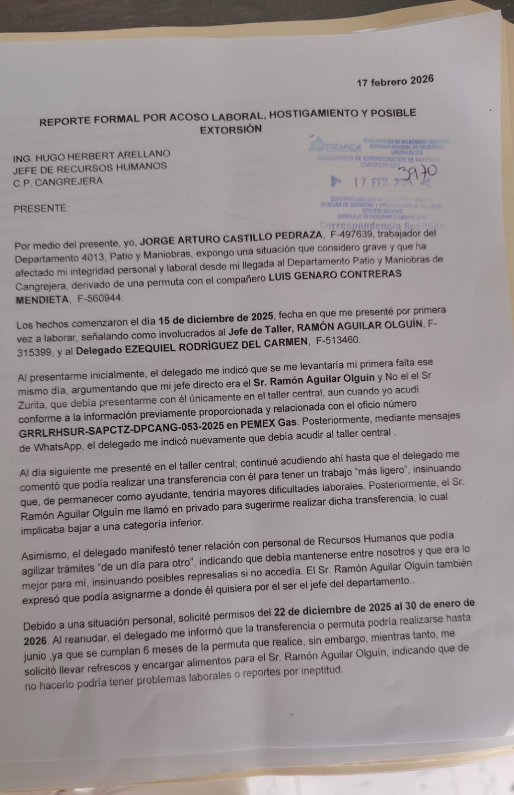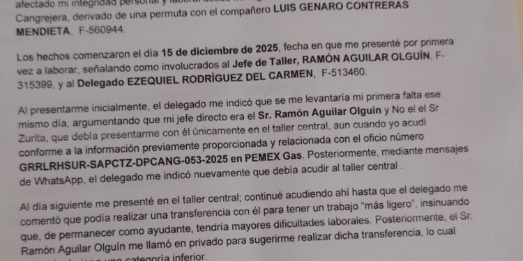 Denuncia al 9933989844… 🚩⚠️ ¡CP CANGREJERA: Exponen otras marrullerías de OLGUÍN/EZEQUIEL/ CAOZ/HERBERT/TOLEDO-STPRM! Trabajadores del Complejo Petroquímico (CP) Cangrejera del gerente Octaviano Tenorio Herrera en Coatzacoalcos, Veracruz, señalan que siguen haciendo de las suyas los jefes del Departamento Patio y Maniobras, peor aún es que acumulan acumulan acusaciones en su contra sin que Recursos Humanos @Pemex haga algo al respecto, lo que los coloca en un estado de indefensión. En este nuevo hecho, le hicieron la vida imposible al trabajador Jorge Arturo Castillo Pedraza (F-497639) quien llegó de permuta de Ciudad Madero al CP Cangrejera. Según el oficio de queja por acoso laboral, hostigamiento y posible extorsión dirigido a Hugo Herbert Arellano, jefe de Recursos Humanos, Castillo Pedraza, trabajador del Departamento 4013, Patio y Maniobras, derivado de una permuta con Luis Genaro Contreras Mendieta (F-560944), el pasado 15 de diciembre de 2025, se presentó a laborar, señalando como involucrados al jefe de Taller, Ramón Aguilar Olguín (F-315399) y al delegado Ezequiel Rodríguez del Carmen (F-513460). Cuenta que el delegado le indicó que le levantaría su primera falta ese mismo día, argumentando que su jefe directo era Ramón Aguilar Olguín y no el “señor Zurita”, por lo que debía presentarme en el taller central, aun cuando Castillo Pedraza acudió conforme a la información previamente proporcionada y relacionada con el oficio número GRRLRHSUR-SAPCTZ-DPCANG-053-2025 en @Pemex Gas. Posteriormente, mediante mensajes de WhatsApp, el delegado le indicó nuevamente que debía acudir al taller central. Al día siguiente se presentó en el taller central; continuó acudiendo hasta que el delegado le comentó que podía realizar una transferencia con el para tener un trabajo “más ligero”, insinuando que, de permanecer como ayudante, el tendría mayores dificultades laborales. Posteriormente, Ramón Aguilar Olguín le llamó en privado para sugerirle realizar dicha transferencia, lo cual implicaba bajarlo a una categoría inferior. Asimismo, el delegado manifestó tener relación con personal de Recursos Humanos que podía agilizar trámites “de un día para otro”, indicando que debía mantenerse entre ellos y que era lo mejor para el, insinuando posibles represalias si no accedía. Ramón Aguilar Olguín también expresó que podía asignarlo a donde él quisiera por el ser el jefe del departamento. Debido a una situación personal, solicité permisos del 22 de diciembre de 2025 al 30 de enero de 2026. Al reanudar, el delegado me informó que la transferencia o permuta podría realizarse hasta junio ya que se cumplan 6 meses de la permuta que realizó; sin embargo, mientras tanto, le solicitó llevar refrescos y encargar alimentos para Ramón Aguilar Olguín, indicando que de no hacerlo podría tener problemas laborales o reportes por ineptitud. El 5 de febrero de 2026, durante el turno 2 de 8 am a 16 pm, aún encontrándose el delegado de vacaciones, recibió una llamada donde le pidió encargar comida para el jefe de taller, insinuando que con ello evitaría problemas laborales. Por temor a represalias, accedí, anexando evidencia de la transferencia realizada al establecimiento de alimentos. Inapropiadas dentro del ambiente laboral, incluyendo contacto físico indebido que de manera constante recibió apodos, faltas de respeto y conductas que considera incómodas y ofensivas por parte de Ramón Aguilar Olguín, “porque así se lleva con la raza”. Señalamientos que también denunció en la línea de ética @Pemex anexando pruebas de sus dichos como las transferencias. Asimismo, en otros casos los trabajadores han denunciado a los mismos funcionarios y hechos de abuso -datados y anexados aquí- ante la Sección 11 STPRM del eterno cacique Ramón Hernández Toledo y su títere Manuel de Jesús Toledo Vera donde tampoco transitan las demandas, por lo que señalan podrían ser también parte de esta mafia laboral, a la que se agrega el subdelegado Luis Alberto Cabrera Caoz. Atención @Claudiashein @MarcelaVilleg15 @CNE_Mex @SENER_mx @GobiernoMX @FGRmexico @LuzElena_GE @ASF_Mexico  @SCJN @STPS_mx @Tu_IMSS @SEMARNAT_mx @agencia_asea @CENAGAS_mx @IMPetroleo @SATMX @Hacienda_Mexico @BuenGobierno_mx @Centrofcrl #OIC #UIF #OmarReyesColmenares …Zas!!!