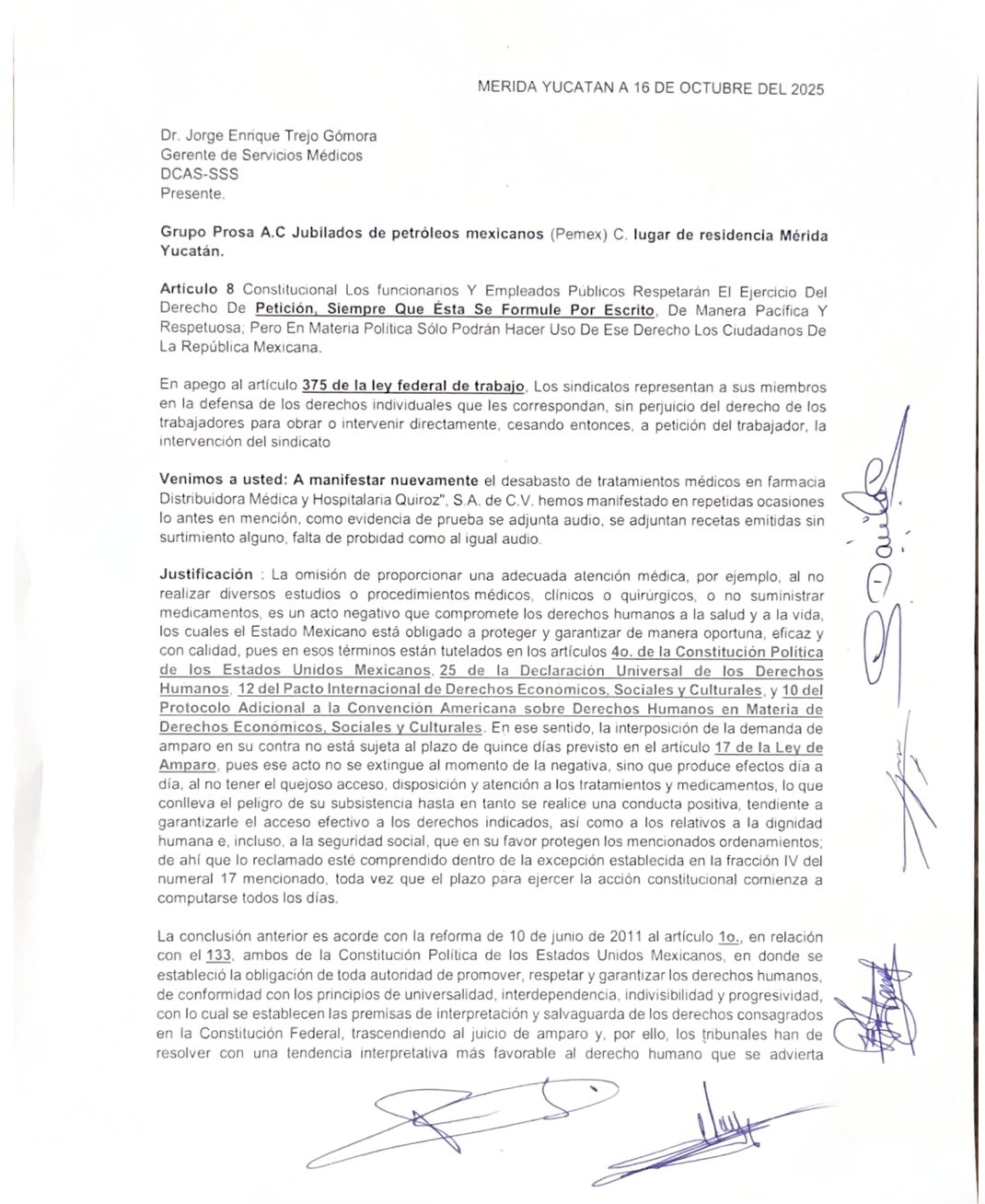 Denuncia al 9933989844… 🚩⚠️💊 ¡Desabasto medicinal y sin médicos en subrogación Pemex: Grupo Prosa!; un grupo de jubilados de @Pemex , organizados en la asociación civil Grupo Prosa AC, denunció de manera formal el desabasto de tratamientos médicos y la falta de atención oportuna en servicios subrogados de salud en Mérida, Yucatán. La inconformidad fue dirigida el 16 de octubre de 2025 al gerente de Servicios Médicos de Pemex, Jorge Enrique Trejo Gómora, adscrito a la DCAS-SSS, a quien señalaron como destinatario de reiteradas manifestaciones previas sobre la misma problemática. De acuerdo con el escrito, los jubilados, con residencia en Mérida, expusieron nuevamente la falta de surtimiento de medicamentos y tratamientos prescritos en la farmacia de la empresa Distribuidora Médica y Hospitalaria Quiroz. Señalaron que esta situación no es aislada ni reciente, sino reiterada, y afirmaron contar con elementos probatorios que incluyen recetas médicas no surtidas y registros de comunicación que evidencian la persistencia del problema, así como la ausencia de respuesta efectiva por parte de los responsables del servicio. El grupo fundamentó su intervención en el derecho de petición consagrado en el Artículo 8 Constitucional, subrayando que su solicitud fue formulada por escrito, de manera pacífica y respetuosa. Asimismo, precisaron que, conforme al Artículo 375 de la Ley Federal del Trabajo (LFT), los sindicatos representan a sus miembros en la defensa de derechos individuales, sin que ello limite el derecho de los trabajadores o jubilados a intervenir directamente cuando así lo decidan, cesando la intervención sindical a petición expresa del interesado. En el documento se sostiene que la omisión de brindar una atención médica adecuada, ya sea por no realizar estudios, procedimientos clínicos o quirúrgicos, o por no suministrar medicamentos, constituye un acto negativo que compromete de manera directa los derechos humanos a la salud y a la vida. Estos derechos, recordaron, están protegidos por el Artículo 4 de la Constitución Mexicana y por diversos instrumentos internacionales ratificados por el Estado Mexicano, entre ellos la Declaración Universal de los Derechos Humanos, el Pacto Internacional de Derechos Económicos, Sociales y Culturales y el Protocolo Adicional a la Convención Americana sobre Derechos Humanos en materia de derechos económicos, sociales y culturales. Señalaron que cualquier acción legal, como la interposición de un juicio de amparo, no estaría sujeta a un plazo cerrado, dado que la afectación persiste y pone en riesgo la subsistencia, la dignidad humana y el derecho a la seguridad social de los afectados. El escrito también hace referencia a la reforma constitucional en materia de derechos humanos de junio de 2011, que impone a todas las autoridades la obligación de promover, respetar, proteger y garantizar estos derechos bajo los principios de universalidad, interdependencia, indivisibilidad y progresividad. Grupo Prosa AC solicitó de manera expresa la aplicación de la Cláusula 89 del Contrato Colectivo de Trabajo Vigente (CCTV) 2023-2025 del STPRM, la cual establece la obligación del patrón y del sindicato de prevenir la pérdida de la salud, conservarla y mejorarla. Esta cláusula contempla la prestación de atención médica integral, oportuna, eficiente y humanitaria para trabajadores, jubilados y derechohabientes, utilizando todos los recursos médicos, quirúrgicos y terapéuticos disponibles, ya sea en instalaciones propias o mediante servicios subrogados cuando así lo justifiquen las necesidades técnicas, con la obligación de informar al sindicato sobre dichas designaciones. En el documento también se invoca el criterio jurídico de la Primera Sala de la Suprema Corte de Justicia de la Nación (SCJN), que establece que las autoridades responsables de garantizar el derecho a la salud deben proporcionar asistencia médica y tratamientos de forma oportuna, permanente y constante, considerando el estado de salud y los requerimientos clínicos del paciente. Este criterio adquiere especial relevancia en padecimientos donde el éxito del tratamiento depende del cumplimiento estricto en la toma de medicamentos, ya que una adherencia deficiente puede provocar la progresión de la enfermedad. Finalmente, los jubilados señalaron que la falta de atención adecuada también vulnera las garantías específicas de igualdad previstas en el artículo 123, apartado A, así como en los artículos 1, 2, 4, 12 y 13 de la Constitución, que reconocen el goce de los derechos humanos para todas las personas, conforme a la Constitución y a los tratados internacionales de los que México es parte. El escrito fue firmado por la directiva de Grupo Prosa AC y turnado con copia a los doctores Carlos Alberto Reyes Valencia, coordinador especialista “D”, y Javier David Alvar Cruz, como constancia y seguimiento del caso; atención @Claudiashein @MarcelaVilleg15 @CNE_Mex @SENER_mx @GobiernoMX @FGRmexico @LuzElena_GE @ASF_Mexico  @SCJN @STPS_mx @Tu_IMSS @SEMARNAT_mx @agencia_asea @CENAGAS_mx @IMPetroleo @SATMX @Hacienda_Mexico @BuenGobierno_mx @Centrofcrl #OIC #UIF #OmarReyesColmenares …Zas!!!