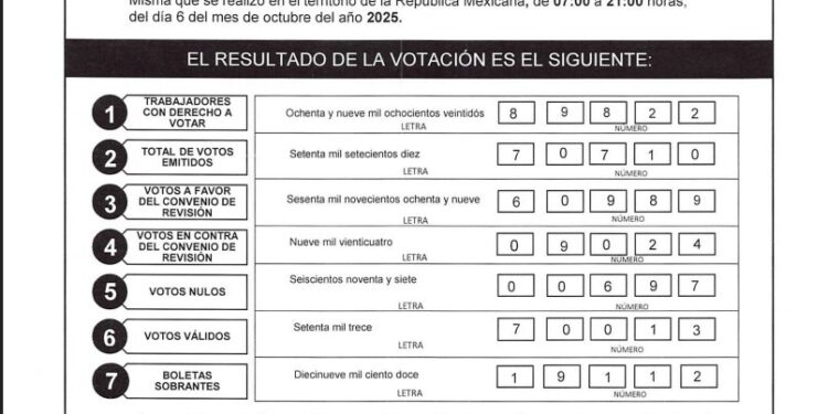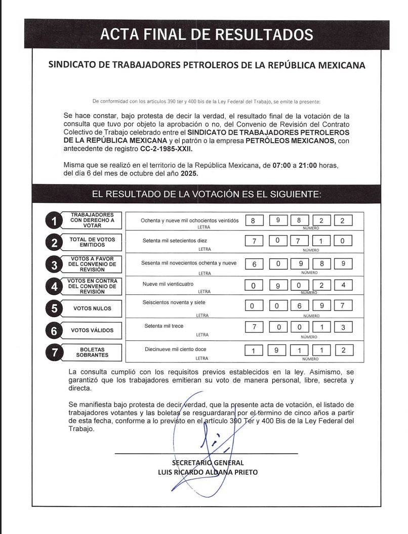Denuncia al 9933989844… 🚩⚠️‼️👨‍🏭 ¡Gana Coacción en Consulta CCT 2025-2027 STPRM del Delfín ALDANA!; a pesar de los pesares, nuevamente la cúpula del STPRM del Delfín de Deschamps, Ricardo Aldana Prieto, le pasa la aplanadora a la disidencia de este sindicato petrolero en la consulta del sí o no al Contrato Colectivo de Trabajo (CCT) 2025-2027, que fue aprobado con todo y Anexo 16 en perjuicio de los trabajadores este pasado 6 de octubre; con pírricos beneficios para sus agremiados, inclusive menos que otras organizaciones sindicales el aumento al salario quedó por debajo del 5%; los incumplimientos y violaciones al CCTV seguirán y en algunos casos peor como el servicio médico donde preparan una reducción al cuadro de medicamentos de 200 productos, entre estos los oncológicos; sobre la consulta, ni qué decir, plagada de coacción al voto en 35 de las 36 secciones, donde quedó clara la ruptura con Los Chepes (Pilar y Zamudio) de la Sección 44 STPRM que se pronunciaron abiertamente para el voto en contra al CCT propuesto; ejercicio -como de costumbre- en que el Comité Ejecutivo General (CEG) jugó de juez y parte en la consulta de cabo a rabo (como boletas sin número de folio), con el aval y complicidad de las autoridades laborales, dando como resultado oficial un total de 70,710 votos emitidos de un universo de 89,822 trabajadores con derecho a votar; de los que 60,989 trabajadores votaron que sí al nuevo CCT y solo 9,024 en contra (a eso quedó reducida la disidencia sindical tras el triunfo del Delfín, a quien por cierto le recriminaron su voto ya que es régimen de confianza Pemex con nivel ), con 70,013 votos efectivos (89%) y 697 votos nulos; y -por último- 19,112 boletas sobrantes (un buen de desánimo entre los agremiados) que no hubieran hecho la diferencia; queda como anécdota el jueves pasado -previo a la consulta- en la refinería Miguel Hidalgo de Tula de Allende, Hgo, el reclamo a Rigoberto Ramírez Sánchez, cacique secretario general de la Sección 35 STPRM, de trabajadores del Departamento de Pailería-Soldadura, de los Departamentos de Mantenimiento de Talleres Generales, cuando llegaron funcionarios sindicales a buscar las firmas para la asamblea-consulta del lunes pasado, cuando le cuestionaron la revisión y jubilación digna, además que si a su hijo y familiares los metió al Gobierno de Atitalaquia como regidor de @PartidoMorenaMx al igual que a su sobrina en el Gobierno de Tula igual por Morena; atención @Claudiashein @MarcelaVilleg15 @SENER_mx @FGRmexico @LuzElena_GE @ASF_Mexico @PabloGomez1968 @SCJN @STPS_mx @Tu_IMSS @SEMARNAT_mx @agencia_asea @CENAGAS_mx @IMPetroleo @SATMX @Hacienda_Mexico @BuenGobierno_mx #RaquelBuenrostro #OIC #UIF….Zas!!!