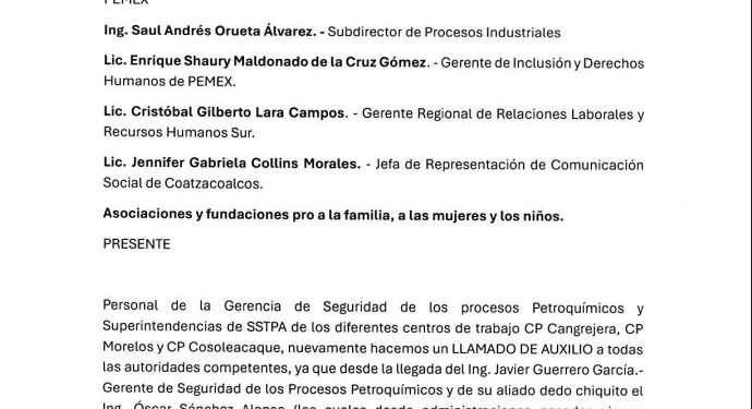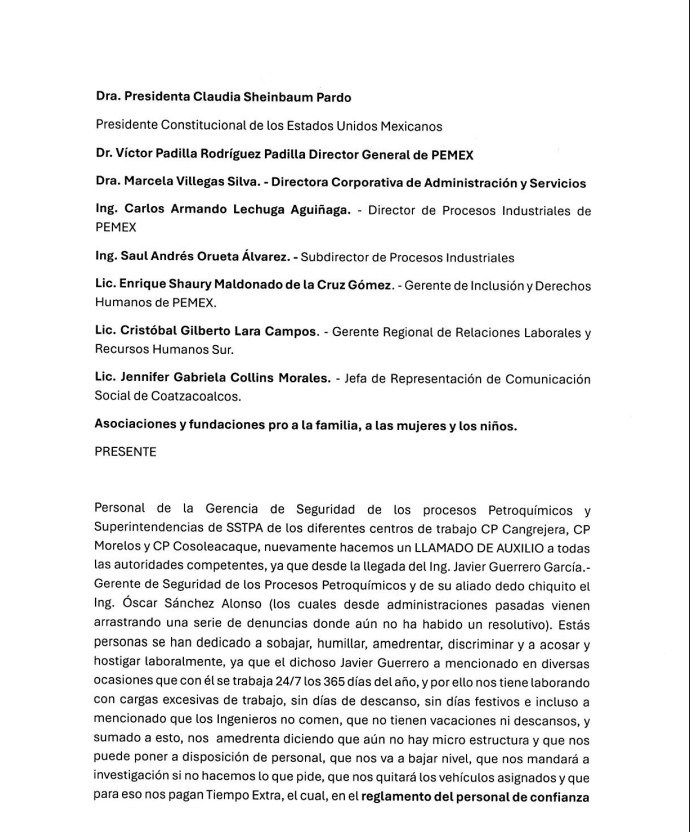 Denuncia al 9933989844… 🚩⚠️ ¡J GUERRERO GARCÍA y O SÁNCHEZ ALONSO: Piden sus cabezas por negreros en CP´s Cangrejera, Morelos y Cosoleacaque! Trabajadores de @Pemex adscritos a los complejos petroquímicos (CP) de Cangrejera, Morelos y Cosoleacaque, en el estado de Veracruz, han emitido un urgente llamado de auxilio dirigido a la presidenta Claudia Sheinbaum Pardo y al director general Víctor Rodríguez Padilla. Los denunciantes exponen una realidad de maltrato sistemático y condiciones que califican como de esclavitud moderna, las cuales contradicen flagrantemente la Declaración Institucional de Igualdad Laboral y No Discriminación promovida por Marcela Villegas Silva, directora de Administración y Servicios. Mientras la narrativa oficial de la empresa asegura basarse en códigos de ética, inclusión y una política de cero tolerancia al hostigamiento, el personal de las áreas de Seguridad de los Procesos Petroquímicos y de las Superintendencias de Seguridad, Salud en el Trabajo y Protección Ambiental (SSTPA) reporta un entorno de violencia laboral y desprecio por los derechos humanos fundamentales. En el centro de las acusaciones se encuentran Javier Guerrero García, gerente de Seguridad de los Procesos Petroquímicos, y su colaborador cercano, Óscar Sánchez Alonso, con 39 años de edad y 9 años de antigüedad en la paraestatal. De acuerdo con los testimonios, estos funcionarios han instaurado un régimen de amedrentamiento y humillación, presuntamente protegidos por Luis Roberto Mortera, subdirector de Producción de Petroquímica Secundaria de Procesos Industriales, quien además es señalado como concuño de Guerrero García. Las quejas enfatizan que Sánchez Alonso carece de la experiencia necesaria para el cargo y que su posición responde a un esquema de nepotismo, utilizando su autoridad para sobajar a personal con mayor trayectoria y conocimientos técnicos en la industria petrolera. Las jornadas laborales descritas por los empleados resultan extremas, alcanzando una disponibilidad exigida de veinticuatro horas durante todo el año, sin respeto a días festivos, vacaciones o descansos mínimos. Se detalla que el personal es obligado a cumplir turnos nocturnos que concluyen a la medianoche para luego reincorporarse a las siete de la mañana, disponiendo de apenas unas horas para el reposo. Estas prácticas se acompañan de amenazas constantes de degradación salarial, traslados forzosos o investigaciones administrativas si no se cumplen órdenes irregulares, como la firma de documentación que sobrepasa sus competencias legales. La gravedad de la situación ha escalado al punto de reportarse casos de parálisis facial por estrés, cuadros de ansiedad severa, depresión e incluso lo que califican como “secuestro” de dos trabajadores en el complejo Morelos tras ser forzados a laborar en horarios y días no laborables. La crisis laboral también tiene un impacto diferente en las mujeres trabajadoras, quienes se ven impedidas de cumplir con sus responsabilidades familiares y el cuidado de sus hijos debido a la falta de flexibilidad y las reuniones convocadas sin previo aviso a altas horas de la madrugada o en fines de semana. Las denuncias señalan que los directivos ignoran las necesidades de salud de los empleados y de sus familias, obligándoles a abandonar terapias médicas por miedo a represalias. Este escenario viola múltiples normativas mencionadas por los afectados, incluyendo la Ley Federal del Trabajo, la NOM-035 sobre factores de riesgo psicosocial y la Ley General de Acceso de las Mujeres a una Vida Libre de Violencia, además de contravenir los artículos 26 y 27 del Reglamento del Personal de Confianza respecto a la compensación y límites del tiempo extra. Ante la falta de resultados de denuncias previas ante la línea de ética de @Pemex , de las cuales Guerrero García presuntamente se jacta de haber evadido, el personal solicita la intervención directa de otras autoridades de alto nivel. Entre los funcionarios notificados se encuentran Carlos Armando Lechuga Aguiñaga, director de Procesos Industriales; Saúl Andrés Orueta Álvarez, subdirector de Procesos Industriales; Enrique Shaury Maldonado de la Cruz Gómez, gerente de Inclusión y Derechos Humanos; Cristóbal Gilberto Lara Campos, gerente Regional de Relaciones Laborales y Jennifer Gabriela Collins Morales, jefa de Representación de Comunicación Social en Coatzacoalcos. La demanda es clara: una investigación formal, la destitución de los responsables y la implementación de medidas urgentes que garanticen un entorno de bienestar y seguridad en instalaciones estratégicas para el país. Atención @Claudiashein @MarcelaVilleg15 @CNE_Mex @SENER_mx @GobiernoMX @FGRmexico @LuzElena_GE @ASF_Mexico  @SCJN @STPS_mx @Tu_IMSS @SEMARNAT_mx @agencia_asea @CENAGAS_mx @IMPetroleo @SATMX @Hacienda_Mexico @BuenGobierno_mx @Centrofcrl #OIC #UIF #OmarReyesColmenares …Zas!!!