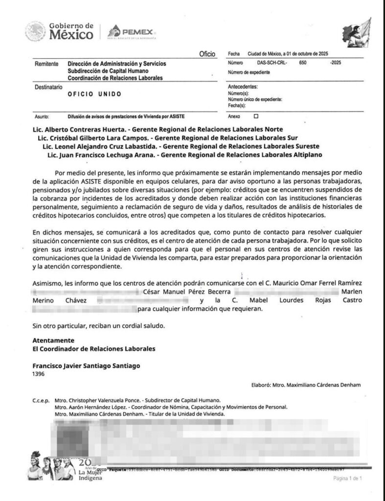 Denuncia al 9933989844… 🚩⚠️‼️🏡 ¡Llaman a cuentas en créditos de vivienda a petroleros por ASISTE Pemex!; precisamente, en torno a la encuesta del Programa de Vivienda para los trabajadores del STPRM mediante el ASISTE @Pemex , que El Delfín de Deschamps, Ricardo Aldana Prieto, y sus 36 caciques pretenden boicotear, el pasado 01 de octubre @Pemex lanzó el Oficio Unido DAS-SCH-CRL-650-2025, para la “Difusión de avisos de prestaciones de Vivienda por ASISTE”, con el que se pretende poner al corriente los créditos -mediante aclaraciones y recobros- otorgados a trabajadores en activo sindicalizados y de confianza, jubilados, pensionados y viudas; según el documento dirigido a los gerentes regionales Norte, Sur, Sureste y Altiplano por parte de Francisco Javier Santiago Santiago, coordinador de Relaciones Laborales, los trabajadores recibirán mensajes por medio de la aplicación ASISTE en sus celulares para dar aviso oportuno sobre diversas situaciones (por ejemplo: créditos que se encuentren suspendidos de la cobranza por incidentes de los acreditados y donde deben realizar acción con las instituciones financieras personalmente, seguimiento a reclamación de seguro de vida y daños, resultados de análisis de historiales de créditos hipotecarios concluidos, entre otros) que competen a los titulares de créditos hipotecarios; en dichos mensajes, se comunicará a los acreditados que, como punto de contacto para resolver cualquier situación concerniente con sus créditos, es el centro de atención de cada trabajador, por lo que solicitan a los gerentes regionales giren sus instrucciones a quien corresponda para que el personal en sus centros de atención revise las comunicaciones que la Unidad de Vivienda les comparta, para que los trabajadores reciban la orientación y la atención correspondiente; asimismo, se informo que en los centros de atención podrán comunicarse con Mauricio Omar Ferrel Ramírez, César Manuel Pérez Becerra, Marlen Merino Chávez y Mabel Lourdes Rojas Castro para cualquier información que requieran; atención @Claudiashein @MarcelaVilleg15 @SENER_mx @FGRmexico @LuzElena_GE @ASF_Mexico @PabloGomez1968 @SCJN @STPS_mx @Tu_IMSS @SEMARNAT_mx @agencia_asea @CENAGAS_mx @IMPetroleo @SATMX @Hacienda_Mexico @BuenGobierno_mx #RaquelBuenrostro #OIC #UIF….Zas!!!
