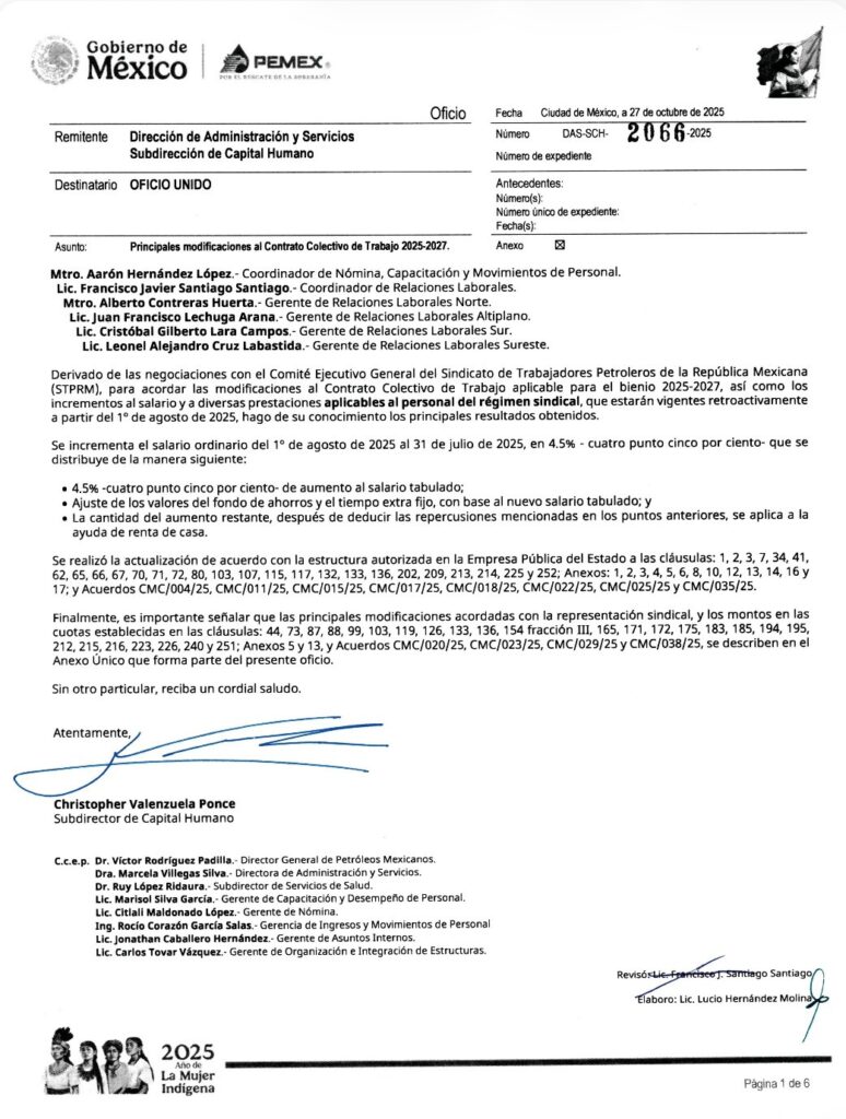 Denuncia al 9933989844… 🚩⚠️🧑🏭 ¡Olvidaron a Viudas, Pensionados y de Confianza en CCT 2025-27 STPRM-Pemex!; mediante el oficio DAS-SCH-2066-2025 de este pasado 27 de octubre de 2025, Christopher Valenzuela Ponce, subdirector de Capital Humano @Pemex , notificó las principales modificaciones al Contrato Colectivo de Trabajo (CCT) 2025-2027 (derivado de las negociaciones con el STPRM del Delfín de Deschamps, Ricardo Aldana Prieto) a los coordinadores y gerentes de Relaciones Laborales, destacando: 1.- 4.5% de aumento al salario tabulado; 2.- Ajuste de los valores del fondo de ahorros y el tiempo extra fijo, con base al nuevo salario tabulado; y 3.- La cantidad del aumento restante, después de deducir las repercusiones mencionadas en los puntos anteriores, se aplica a la ayuda de renta de casa; sin embargo, vienen incluidas igual número de sorpresas: 1.- El Anexo 16 y 2.- El Acuerdo CMC/046/25 que establecen los mecanismos para resolver de manera tripartita la situación laboral de los trabajadores que sean declarados disponibles para su reacomodo, jubilación o liquidación, lo que fue considerado una traición a la base trabajadora, y 3.- Dejaron fuera de los beneficios a 45 mil viudas (pensiones post mortem) que fueron discriminadas, olvidando igual a los pensionados y los empleados de confianza activos, primera vez en la historia de @Pemex que sucede; atención @Claudiashein @MarcelaVilleg15 @CNE_Mex @SENER_mx @GobiernoMX @FGRmexico @LuzElena_GE @ASF_Mexico @SCJN @STPS_mx @Tu_IMSS @SEMARNAT_mx @agencia_asea @CENAGAS_mx @IMPetroleo @SATMX @Hacienda_Mexico @BuenGobierno_mx @Centrofcrl #OIC #UIF #OmarReyesColmenares …Zas!!!