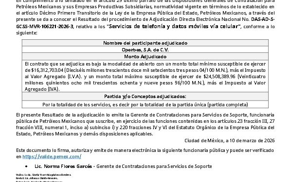 Denuncia al 9933989844… 🚩⚠️ ¡OPERBES: Dedazo Pemex de 24 MDP a TELEVISA; lleva 3 por 102 MDP! El pasado 10 de marzo 2026, la empresa OPERBES de Emilio Fernando Azcárraga Jean, presidente del Consejo de Administración de Grupo Televisa y dueño del Club América, recibió su 3 contrato en @Pemex por 24,508,389.96 pesos que recibió por dedazo mediante la asignación DAS-AD-S-GCSS (Norma Flores Garcés) MVR-106221-2026-3 este 10 de marzo para “servicios de telefonía y datos móviles vía celular”. Con este tercer contrato en el presente sexenio (1 con EPN/Treviño y 1 con AMLO/Agrónomo) suma ya 102,483,389.96 pesos. El fallo fue firmado por Norma Flores Garcés, gerente de Contrataciones para Servicios de Soporte de @Pemex . Su primer contrato registrado en la base de datos de @Pemex fue el 4800030513 donde OPERBES fue en propuesta conjunta con M4 Tecnología y Servicios para servicios conducción de señales por un monto de 60,000,000 pesos vigente del 27/02/2018 al 31/12/2020. Después en solitario firmó el 4800031458 para servicio de enlaces arrendados para @Pemex , sus empresas productivas subsidiarias y filiales por un monto de 17,975,000 pesos, vigente del 31/12/2020 al 30/06/2021. Atención @Claudiashein @MarcelaVilleg15 @CNE_Mex @SENER_mx @GobiernoMX @FGRmexico @LuzElena_GE @ASF_Mexico  @SCJN @STPS_mx @Tu_IMSS @SEMARNAT_mx @agencia_asea @CENAGAS_mx @IMPetroleo @SATMX @Hacienda_Mexico @BuenGobierno_mx @Centrofcrl #OIC #UIF #OmarReyesColmenares …Zas!!!