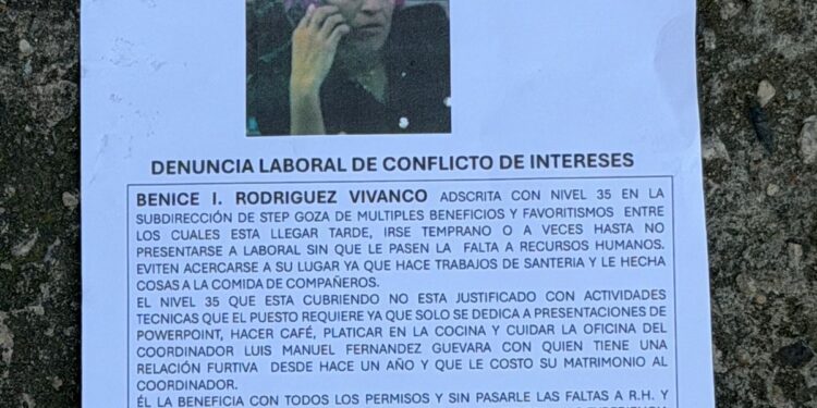 Denuncia al 9933989844… 🚩⚠️ ¡Queman a trabajadora del STEE/STEP del CTA Pemex Villahermosa!; las instalaciones de los baños del Centro Técnico Administrativo (CTA) en Villahermosa, Tabasco, ahora son un mural para las denuncias internas pues pegaron un panfleto durante los últimos meses del 2025 en el que denuncian a Berenice I Rodríguez Vivanco, adscrita con Nivel 35 en la Subdirección Técnica de Exploración y Extracción (STEE antes STEP) quien presuntamente goza de múltiples beneficios y favoritismos entre los cuales está llegar tarde, irse temprano o a veces hasta no presentarse a laboral sin que le pasen la falta a Recursos Humanos. “Eviten acercarse a su lugar ya que hace trabajos de santería y le echa cosas a la comida de compañeros”, reza el documento. El Nivel 35 que está cubriendo no esta justificado con actividades técnicas que el puesto requiere ya que solo se dedica a presentaciones de powerpoint, hacer café, platicar en la cocina y cuidar la oficina del coordinador Luis Manuel Fernández Guevara”, entre otros señalamientos. “Él la beneficia con todos los permisos y sin pasarle las faltas a RH y piensa proponerla para un Nivel 37 cuando hay gente con más experiencia y más años en la Subdirección en cuestión. Se hace un llamado a RH para que revisen su situación contractual y vean que las actividades no son de un Nivel 35”, finaliza el escrito; atención @Claudiashein @MarcelaVilleg15 @CNE_Mex @SENER_mx @GobiernoMX @FGRmexico @LuzElena_GE @ASF_Mexico  @SCJN @STPS_mx @Tu_IMSS @SEMARNAT_mx @agencia_asea @CENAGAS_mx @IMPetroleo @SATMX @Hacienda_Mexico @BuenGobierno_mx @Centrofcrl #OIC #UIF #OmarReyesColmenares …Zas!!!