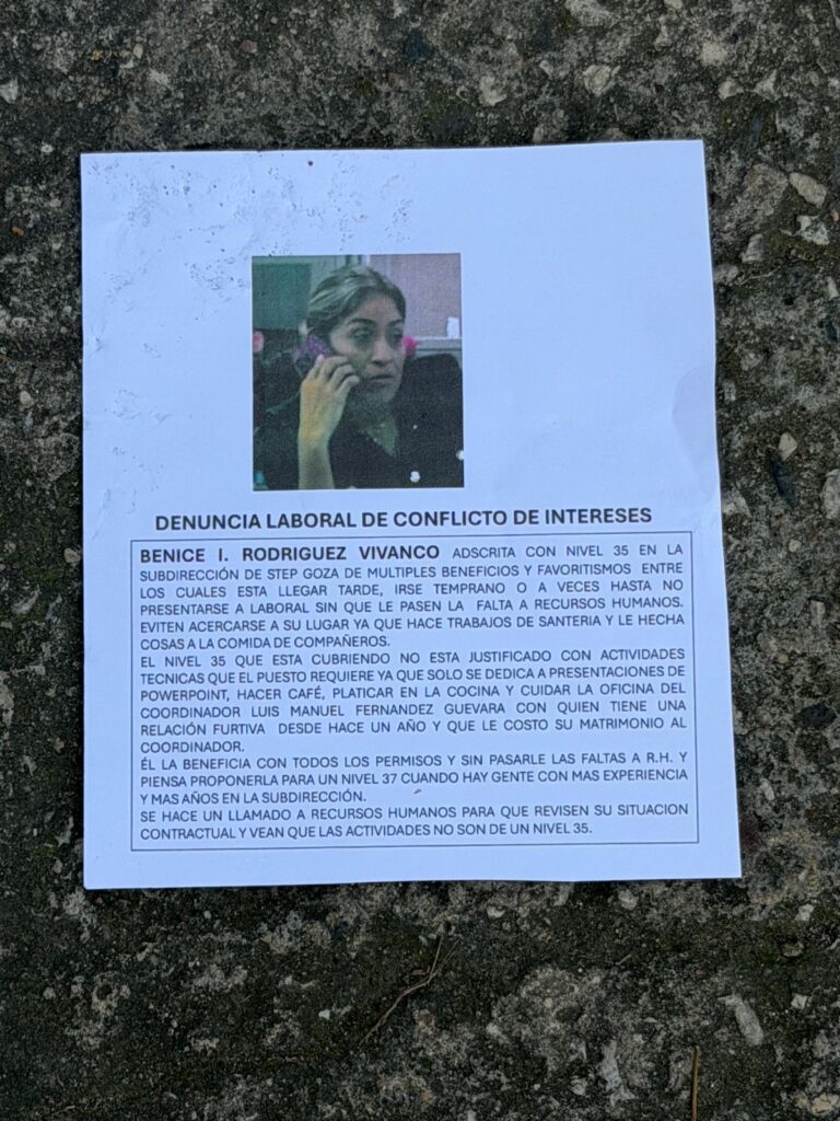 Denuncia al 9933989844… 🚩⚠️ ¡Queman a trabajadora del STEE/STEP del CTA Pemex Villahermosa!; las instalaciones de los baños del Centro Técnico Administrativo (CTA) en Villahermosa, Tabasco, ahora son un mural para las denuncias internas pues pegaron un panfleto durante los últimos meses del 2025 en el que denuncian a Berenice I Rodríguez Vivanco, adscrita con Nivel 35 en la Subdirección Técnica de Exploración y Extracción (STEE antes STEP) quien presuntamente goza de múltiples beneficios y favoritismos entre los cuales está llegar tarde, irse temprano o a veces hasta no presentarse a laboral sin que le pasen la falta a Recursos Humanos. “Eviten acercarse a su lugar ya que hace trabajos de santería y le echa cosas a la comida de compañeros”, reza el documento. El Nivel 35 que está cubriendo no esta justificado con actividades técnicas que el puesto requiere ya que solo se dedica a presentaciones de powerpoint, hacer café, platicar en la cocina y cuidar la oficina del coordinador Luis Manuel Fernández Guevara”, entre otros señalamientos. “Él la beneficia con todos los permisos y sin pasarle las faltas a RH y piensa proponerla para un Nivel 37 cuando hay gente con más experiencia y más años en la Subdirección en cuestión. Se hace un llamado a RH para que revisen su situación contractual y vean que las actividades no son de un Nivel 35”, finaliza el escrito; atención @Claudiashein @MarcelaVilleg15 @CNE_Mex @SENER_mx @GobiernoMX @FGRmexico @LuzElena_GE @ASF_Mexico  @SCJN @STPS_mx @Tu_IMSS @SEMARNAT_mx @agencia_asea @CENAGAS_mx @IMPetroleo @SATMX @Hacienda_Mexico @BuenGobierno_mx @Centrofcrl #OIC #UIF #OmarReyesColmenares …Zas!!!