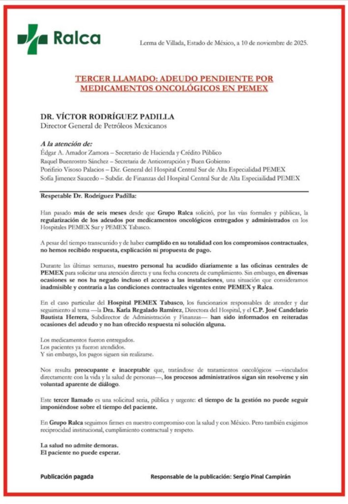 Denuncia al 9933989844… 🚩⚠️💊😷 ¡RALCA reclama pagos a Pemex por medicina oncológica!; de mal en peor los servicios de Salud @Pemex que dirige Ruy López Riadura, ya que ante la situación de impago a decenas de proveedores con adeudos desde 2024 a la fecha, estos suspendieron la proveeduría en áreas sensibles como Oncología y reclaman sus pagos, es el caso de la empresa RALCA que mediante un documento dirigido a Porfirio Visoso Palacios, director general del Hospital Central Sur de Alta Especialidad (Picacho) @Pemex en la CDMX, y Karla Regalado Ramírez, directora del Hospital Regional Villahermosa @Pemex , cita que “han pasado más de seis meses desde que Grupo Ralca solicitó, por las vías formales y públicas, la regularización de los adeudos por medicamentos oncológicos entregados y administrados en los Hospitales @Pemex Sur y @Pemex Tabasco”, ya que a pesar del tiempo transcurrido y de haber cumplido en su totalidad con los compromisos contractuales, no han recibido respuesta, explicación ni propuesta de pago; durante las últimas semanas, su personal ha acudido diariamente a las oficinas centrales de @Pemex para solicitar una atención directa y una fecha concreta de cumplimiento; sin embargo, en diversas ocasiones les han negado incluso el acceso a las instalaciones, una situación que consideran inadmisible y contraria a las condiciones contractuales vigentes entre @Pemex y Ralca; “en el caso particular del Hospital @Pemex Tabasco, los funcionarios responsables de atender y dar seguimiento al tema -Karla Regalado Ramírez, directora, y José Candelario Bautista Herrera, subdirector de Administración y Finanzas- han sido informados en reiteradas ocasiones del adeudo y no han ofrecido respuesta ni solución alguna”; los medicamentos fueron entregados, los pacientes ya fueron atendidos y los pagos siguen sin realizarse, citan; por lo que “nos resulta preocupante e inaceptable que, tratándose de tratamientos oncológicos —vinculados directamente con la vida y la salud de personas—, los procesos administrativos sigan sin resolverse y sin voluntad aparente de diálogo”; atención @Claudiashein @MarcelaVilleg15 @CNE_Mex @SENER_mx @GobiernoMX @FGRmexico @LuzElena_GE @ASF_Mexico @SCJN @STPS_mx @Tu_IMSS @SEMARNAT_mx @agencia_asea @CENAGAS_mx @IMPetroleo @SATMX @Hacienda_Mexico @BuenGobierno_mx @Centrofcrl #OIC #UIF #OmarReyesColmenares …Zas!!!