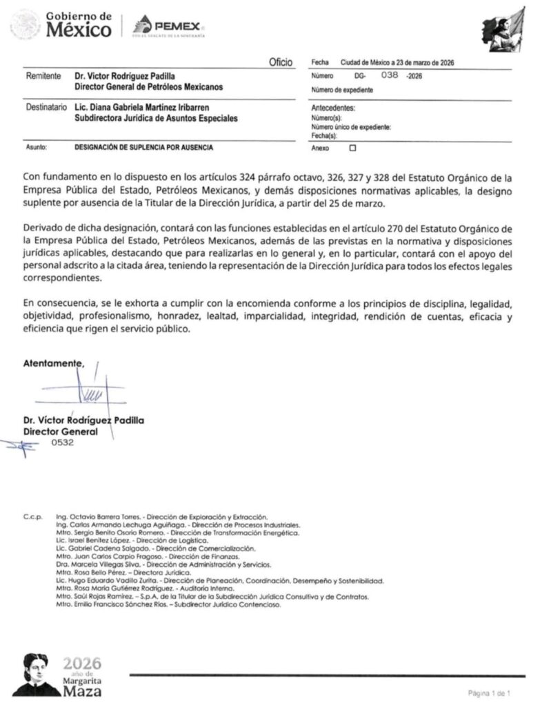 Denuncia al 9933989844… 🚩⚠️‼️¡Remueven a ROSA BELLO de Dirección Jurídica Pemex; queda DIANA MARTÍNEZ como SPA! Mediante el oficio DG-038-2026 lanzado el 23 de marzo de los corrientes, el director general de @Pemex , Víctor Rodríguez Padilla, removió a Rosa Bello Pérez de la Dirección Jurídica de la paraestatal, en donde designó como SPA a Diana Gabriela Martinez İribarren, quien se venía desempeñando como subdirectora Jurídica de Asuntos Especiales a partir del 25 de marzo pasado. Esto destacando que para realizarlas en lo general y, en lo particular, contará con el apoyo del personal adscrito a la citada área, teniendo la representación de la Dirección Jurídica para todos los efectos legales correspondientes. Atención @Claudiashein @MarcelaVilleg15 @CNE_Mex @SENER_mx @GobiernoMX @FGRmexico @LuzElena_GE @ASF_Mexico @SCJN @STPS_mx @Tu_IMSS @SEMARNAT_mx @agencia_asea @CENAGAS_mx @IMPetroleo @SATMX @Hacienda_Mexico @BuenGobierno_mx @Centrofcrl #OIC #UIF #OmarReyesColmenares …Zas!!!