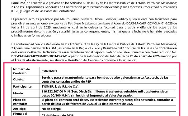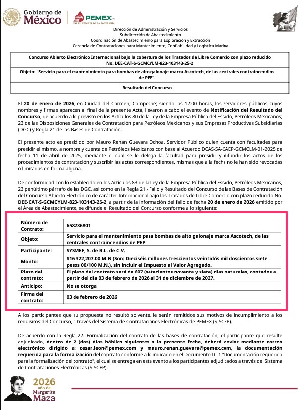 Denuncia al 9933989844…🚩⚠️ ¡SYSMEF: 2 Hit en @Pemex por 16 MDP; microempresa del Centro de Cd del Carmen acumula 60 MDP en 2026! Con todo y teniendo una estratificación de “microempresa”, SYSMEF de Erasmo Fernández Guardado, recibió el fallo de la licitación DEE-CAT-S-GCMCYLM (María Isabel Segovia Magaña) 823-103143-25-2 para mantenimiento de bombas de alto galonaje marca ASCOTECH, de las centrales contraincendios de PEP (DEE) por un monto de 16,322,207 pesos bajo el contrato 658236801, a un plazo de 697 contados a partir del 3 de febrero de 2026 al 31 de diciembre de 2027. El acta del resultado del concurso fue firmada por el titular del Área de Contratación de Mantenimiento, SAM, GCMCLM, CAEE, SA, DAS, César León Domínguez, y por el coordinador “B” Especialidad Técnica, SAM, GCMCLM, CAEE, SA, DAS. Mauro Renán Guevara Ochoa. En este concurso @Pemex tampoco mostró -indebidamente- los montos de las aperturas de propuestas en este concurso donde participaron: 1.- Instrumentación y Servicios Petroleros del Sureste; 2.- Tecnología y Estudios GEOS; 3.- Suministros Industriales de la Península; 4.- ANCLA BROKER Business Model. En registros de la Plataforma Nacional de Transparencia (PNT), la micro-empresa SYSMEF tiene domicilio en la calle 28 en Ciudad del Carmen, Campeche, en pleno centro de la isla, una calle donde no hay instalaciones ni talleres industriales, en su mayoría sólo casas viejas y negocios de comida. Con este 2 contrato, acumula más de 60,906,124.87 pesos; en el primero Pemex le adjudicó el 23 de enero de 2026 el fallo de la licitación DEE-CAT-S-GCEE-100-102903-25-1 para servicio de mantenimiento a grúas marinas marca UNIT incluyendo refacciones para los equipos de perforación y mantenimiento de pozos a cargo de la SPMP; contrato que ejecutará en propuesta conjunta con MUUCH’ CERSA por 8,286,829 pesos + 2,061,431 dólares (44,583,917.87 pesos aproximadamente) con vigencia del 31 de diciembre de 2028. O sea ambas licitaciones definidas por MARCA de equipamiento. Atención @Claudiashein @MarcelaVilleg15 @CNE_Mex @SENER_mx @GobiernoMX @FGRmexico @LuzElena_GE @ASF_Mexico @SCJN @STPS_mx @Tu_IMSS @SEMARNAT_mx @agencia_asea @CENAGAS_mx @IMPetroleo @SATMX @Hacienda_Mexico @BuenGobierno_mx @Centrofcrl #OIC #UIF #OmarReyesColmenares …Zas!!!