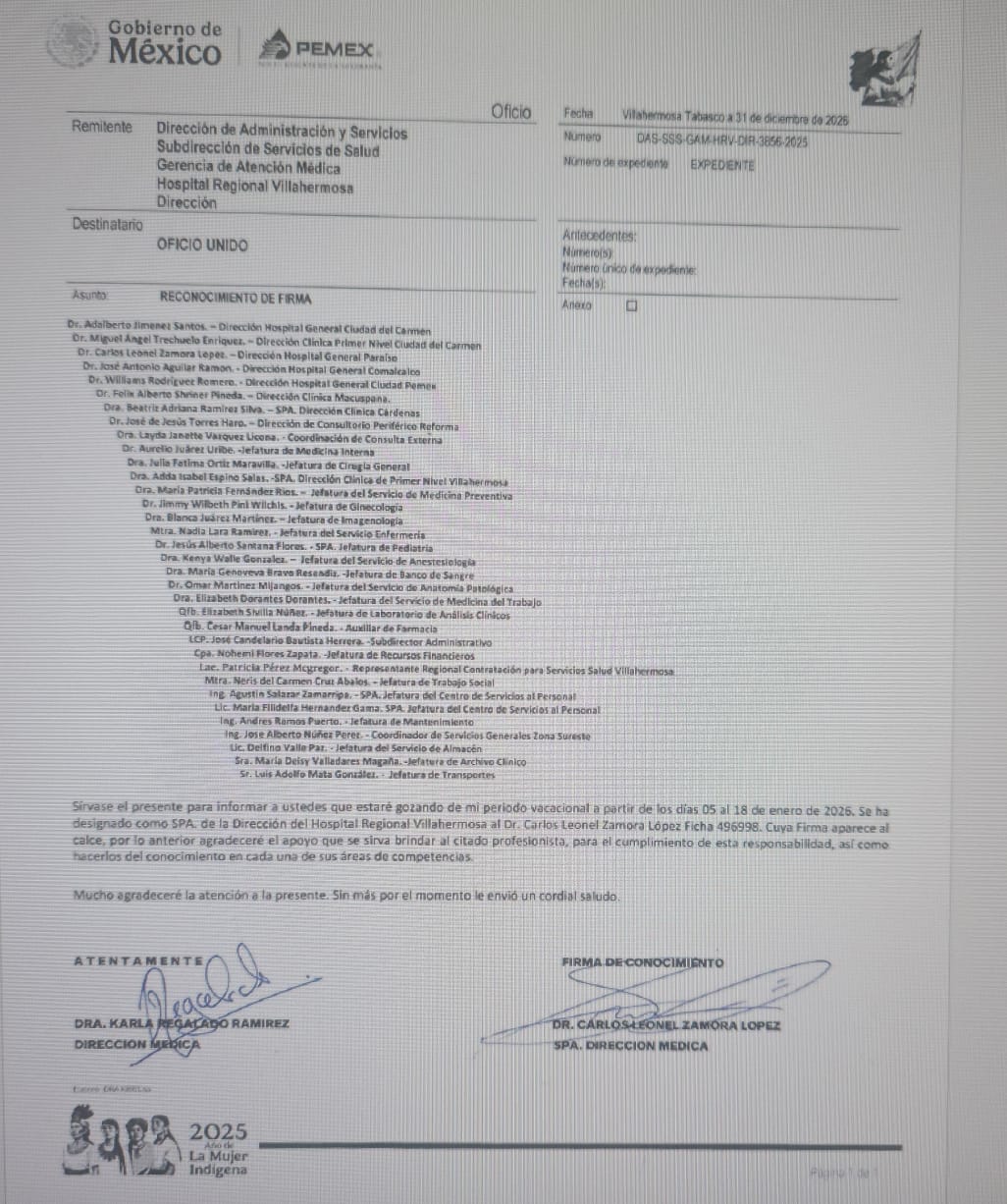 Denuncia al 9933989844… 🚩⚠️🚔 ¡ZAMUDIO huele a cárcel; ZAMORA, SPA Dirección del HRV Pemex por vacaciones de REGALADO!; este 2026, en plena temporada de Reyes Magos, la directora del Hospital Regional Villahermosa, Tabasco, @Pemex (HRV), llamado también “El Hospital del Terror”, Karla Regalado Ramírez, mediante el oficio DAS-SSS-GAM-HRV-DIR 3856-3025, liberado el mero 31 de diciembre 2025, dejó al frente por “vacaciones” del 05 al 18 de enero como SPA a su similar Carlos Leonel Zamora López, quien es director del Hospital General @Pemex en Paraíso, Tabasco; el asunto aquí es que lo “normal” sería que hubiere quedado en su lugar como SPA el subdirector médico del HRV, Alejandro Zamudio Aguilera (F-312236), como sucedió con el oficio anterior a este con número DAS-SSS-GAM-HRV-DIR-3760-2025, liberado el 23 de diciembre 2025, cuando Regalado se ausentó 3 días; la razón es que le están cuidando la espalda a Zamudio, quien está bajo investigación por acoso sexual por parte de la Fiscalía General de la República (FGR) interpuesta por la responsable del Banco de Sangre, por lo que casi no llega a trabajar y cuando llega se la pasa escondido en su oficina por miedo a que lo detengan; mientras todo esto sucede, los derecho habientes son los que pagan los platos rotos por toda esta inoperancia directiva en medio de una crisis financiera en este nosocomio desde el sexenio pasado; no hay para cuando habiliten el laboratorio clínico que ya tiene semanas cerrado, entre un sin fin de anomalías por falta de insumos médicos, medicinas, cirugías, mantenimiento a equipos e instalaciones, pagos a proveedores y más; atención @Claudiashein @MarcelaVilleg15 @CNE_Mex @SENER_mx @GobiernoMX @FGRmexico @LuzElena_GE @ASF_Mexico  @SCJN @STPS_mx @Tu_IMSS @SEMARNAT_mx @agencia_asea @CENAGAS_mx @IMPetroleo @SATMX @Hacienda_Mexico @BuenGobierno_mx @Centrofcrl #OIC #UIF #OmarReyesColmenares …Zas!!!